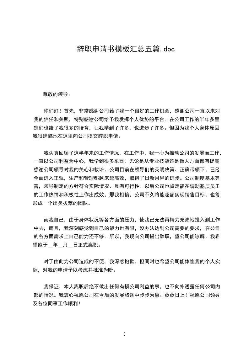 我怀着复杂的心情写这封辞职信。_年前在公司时,我就感觉胃一直不舒服,也吃了不少药。过年时检查,医生建议我不能再吃辣椒,胃需要慢慢养。由于个人的原因,我不得不向公司提出申请,并希望能与今年_月__日正式离职。