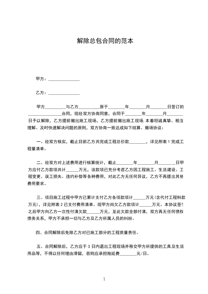 五、合同解除后,乙方应于3日内退出工程现场并移交甲方所提供的工具及生活用品等,不得以任何理由滞留,否则应承担拖延费_______________元/日。