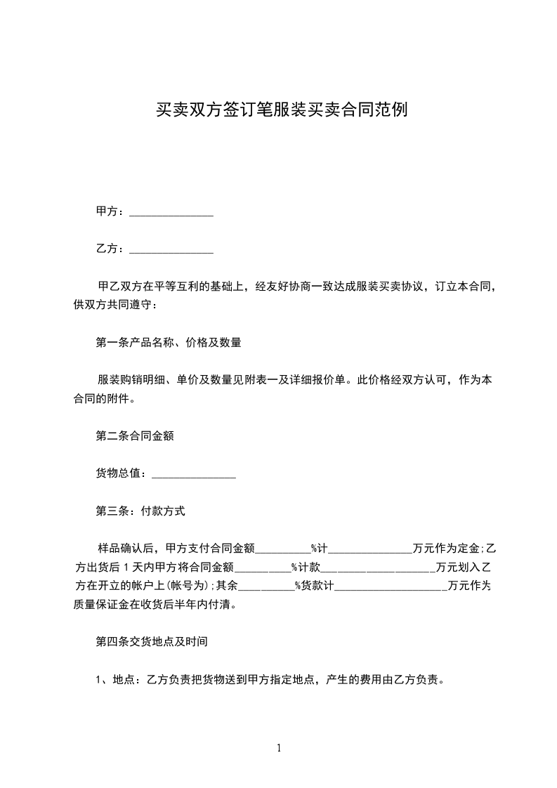 甲乙双方在平等互利的基础上,经友好协商一致达成服装买卖协议,订立本合同,供双方共同遵守: