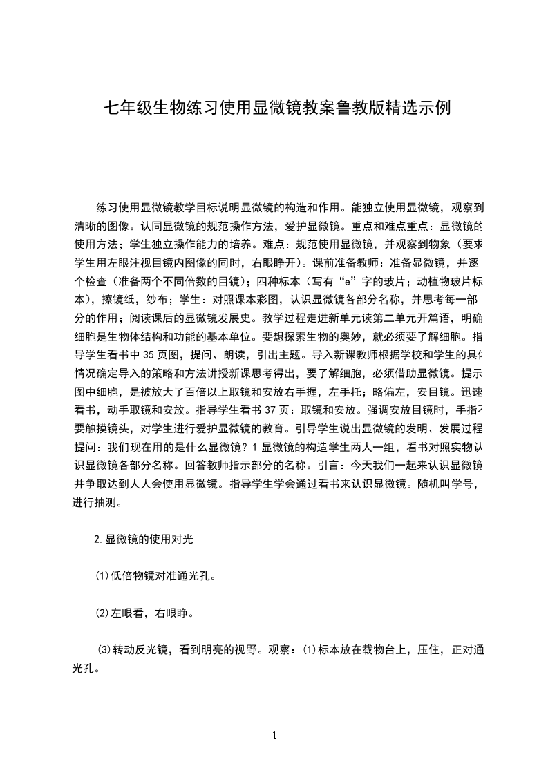 练习使用显微镜教学目标说明显微镜的构造和作用。能独立使用显微镜,观察到清晰的图像。认同显微镜的规范操作方法,爱护显微镜。重点和难点重点:显微镜的使用方法;学生独立操作能力的培养。难点:规范使用显微镜,并观察到物象(要求学生用左眼注视目镜内图像的同时,右眼睁开)。课前准备教师:准备显微镜,并逐个检查(准备两个不同倍数的目镜);四种标本(写有“e”字的玻片;动植物玻片标本),擦镜纸,纱布;学生:对照课本彩图,认识显微镜各部分名称,并思考每一部分的作用;阅读课后的显微镜发展史。教学过程走进新单元读第二单元开篇语,明确细胞是生物体结构和功能的基本单位。要想探索生物的奥妙,就必须要了解细胞。指导学生看书中35页图,提问、朗读,引出主题。导入新课教师根据学校和学生的具体情况确定导入的策略和方法讲授新课思考得出,要了解细胞,必须借助显微镜。提示图中细胞,是被放大了百倍以上取镜和安放右手握,左手托;略偏左,安目镜。迅速看书,动手取镜和安放。指导学生看书37页:取镜和安放。强调安放目镜时,手指不要触摸镜头,对学生进行爱护显微镜的教育。引导学生说出显微镜的发明、发展过程。提问:我们现在用的是什么显微镜?1显微镜的构造学生两人一组,看书对照实物认识显微镜各部分名称。回答教师指示部分的名称。引言:今天我们一起来认识显微镜,并争取达到人人会使用显微镜。指导学生学会通过看书来认识显微镜。随机叫学号,进行抽测。
