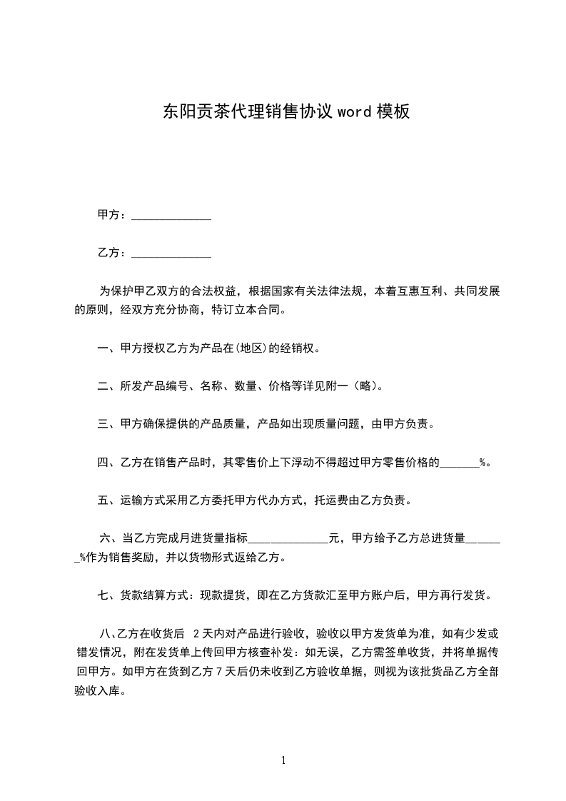 六、当乙方完成月进货量指标______________元,甲方给予乙方总进货量_______%作为销售奖励,并以货物形式返给乙方。