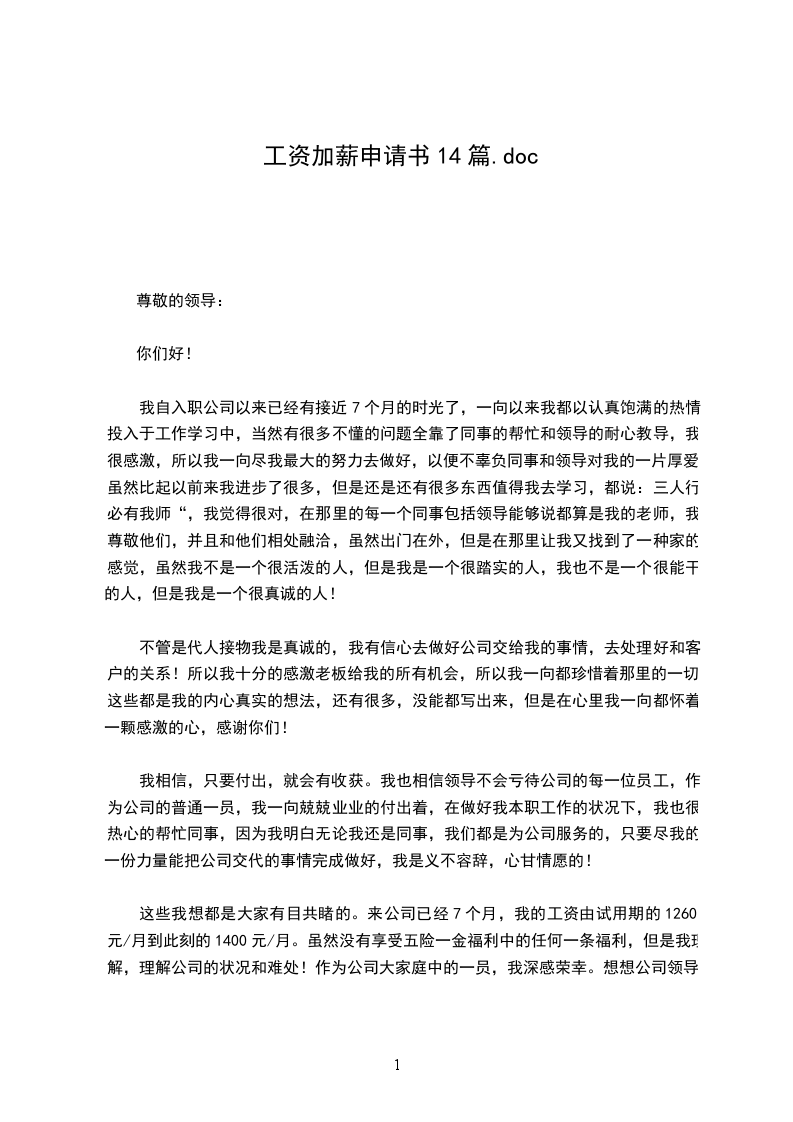 这些我想都是大家有目共睹的。来公司已经7个月,我的工资由试用期的1260元/月到此刻的1400元/月。虽然没有享受五险一金福利中的任何一条福利,但是我理解,理解公司的状况和难处!作为公司大家庭中的一员,我深感荣幸。想想公司领导的厚爱,我觉得自我就应更加努力的的工作,但是我又觉得公私是分明的。所以我提出这份加薪的申请,申请现工资为:3500元/月,期望公司领导能批准我的请求!