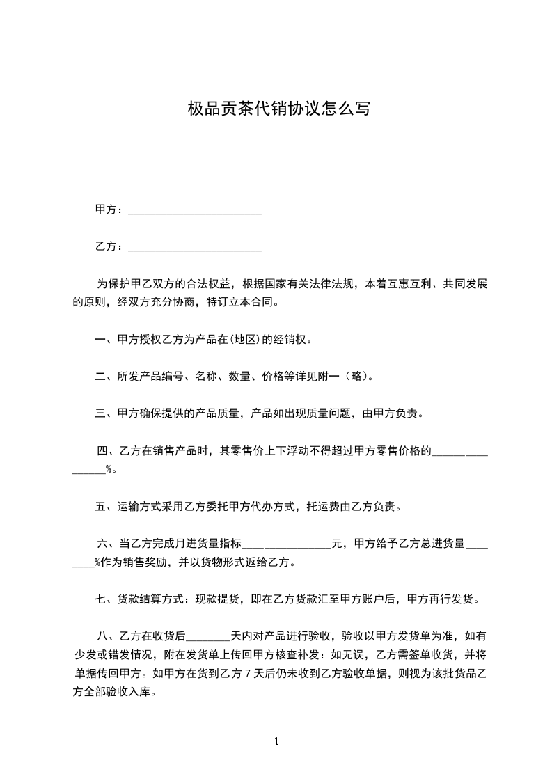 一、甲方授权乙方为产品在(地区)的经销权。