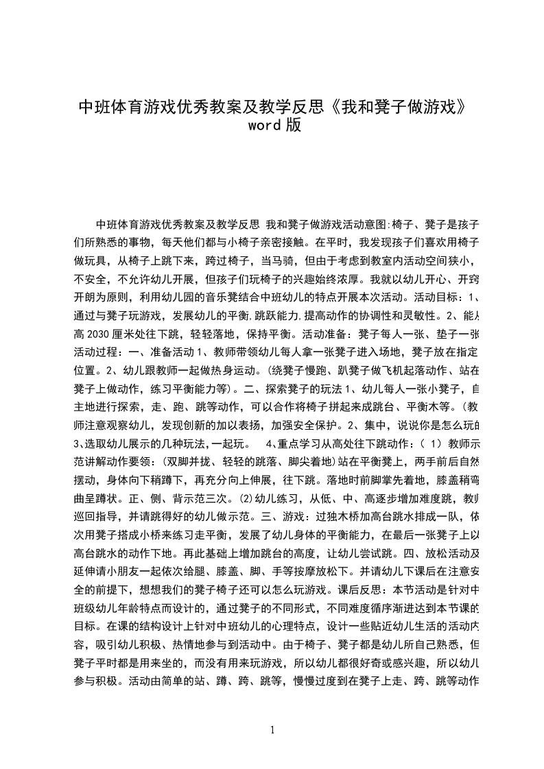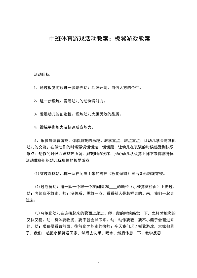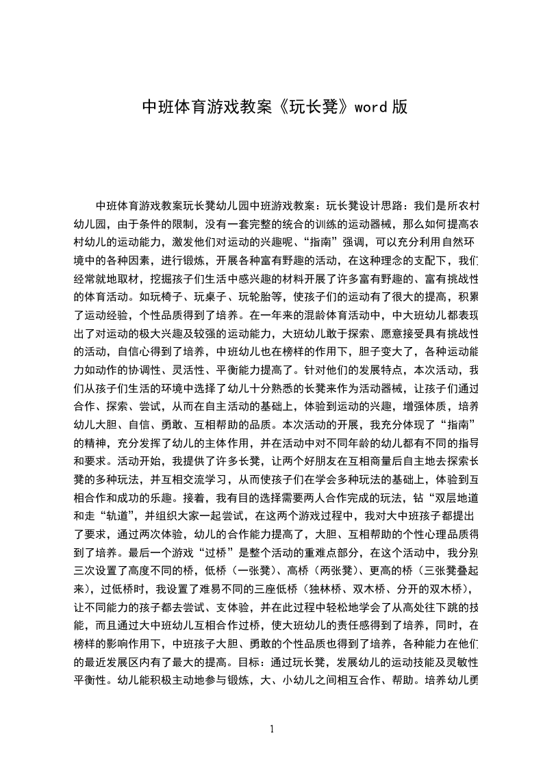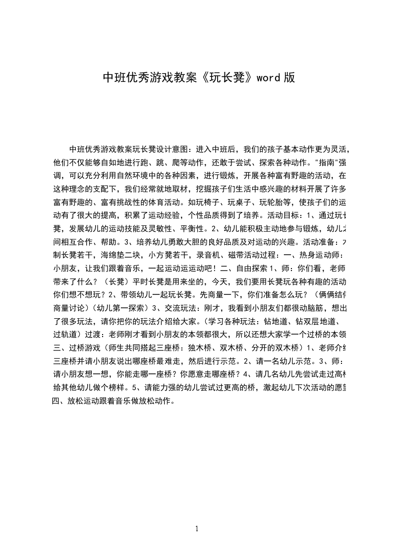 中班优秀游戏教案玩长凳设计意图:进入中班后,我们的孩子基本动作更为灵活,他们不仅能够自如地进行跑、跳、爬等动作,还敢于尝试、探索各种动作。"指南"强调,可以充分利用自然环境中的各种因素,进行锻炼,开展各种富有野趣的活动,在这种理念的支配下,我们经常就地取材,挖掘孩子们生活中感兴趣的材料开展了许多富有野趣的、富有挑战性的体育活动。如玩椅子、玩桌子、玩轮胎等,使孩子们的运动有了很大的提高,积累了运动经验,个性品质得到了培养。活动目标: