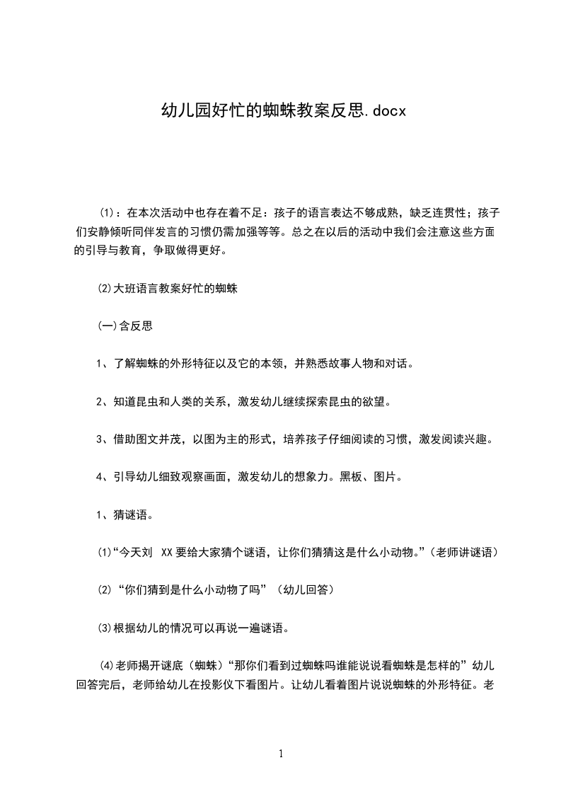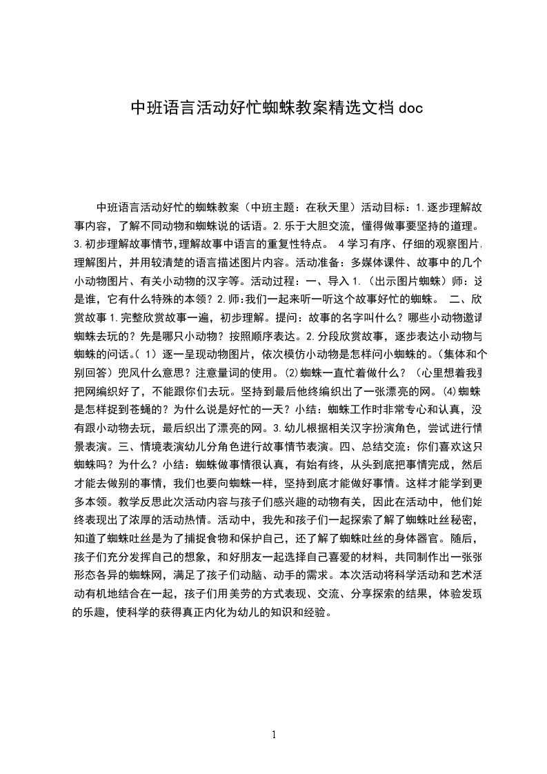 四、总结交流:你们喜欢这只蜘蛛吗?为什么?小结:蜘蛛做事情很认真,有始有终,从头到底把事情完成,然后才能去做别的事情,我们也要向蜘蛛一样,坚持到底才能做好事情。这样才能学到更多本领。教学反思此次活动内容与孩子们感兴趣的动物有关,因此在活动中,他们始终表现出了浓厚的活动热情。活动中,我先和孩子们一起探索了解了蜘蛛吐丝秘密,知道了蜘蛛吐丝是为了捕捉食物和保护自己,还了解了蜘蛛吐丝的身体器官。随后,孩子们充分发挥自己的想象,和好朋友一起选择自己喜爱的材料,共同制作出一张张形态各异的蜘蛛网,满足了孩子们动脑、动手的需求。本次活动将科学活动和艺术活动有机地结合在一起,孩子们用美劳的方式表现、交流、分享探索的结果,体验发现的乐趣,使科学的获得真正内化为幼儿的知识和经验。
