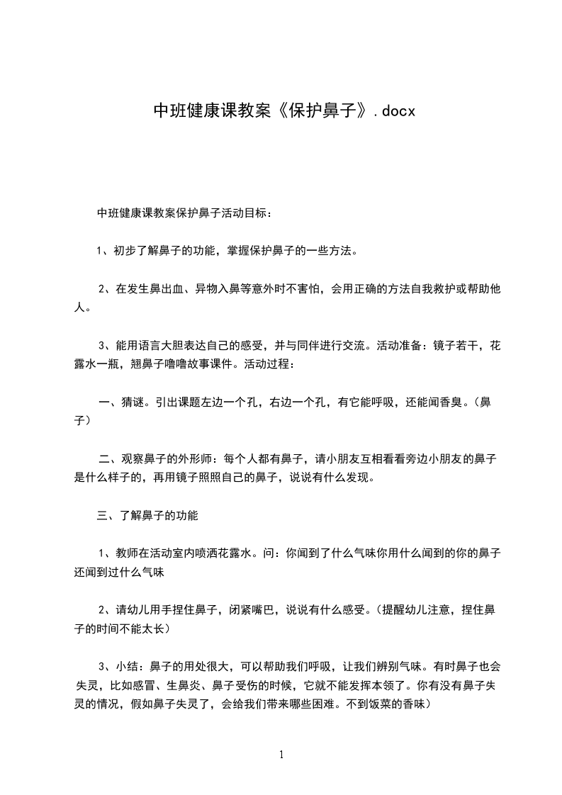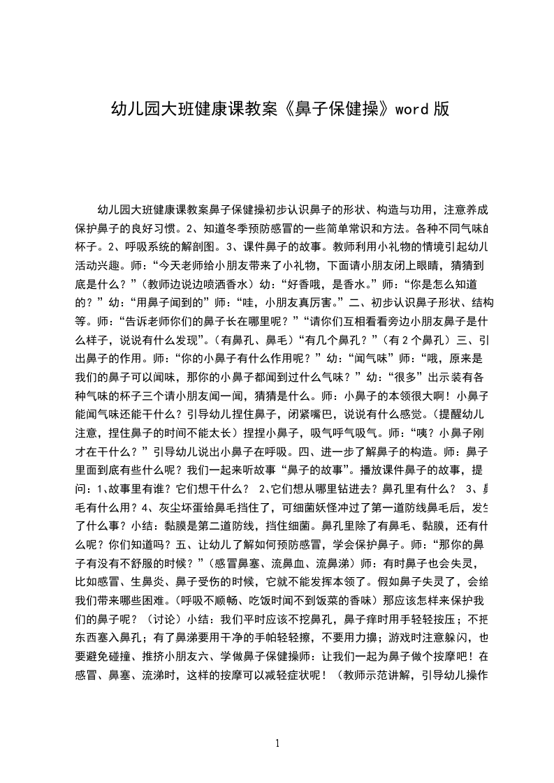 幼儿园大班健康课教案鼻子保健操初步认识鼻子的形状、构造与功用,注意养成保护鼻子的良好习惯。
