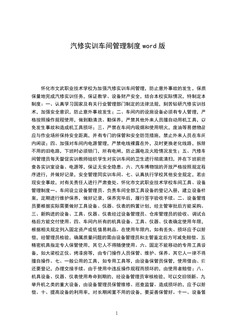 怀化市文武职业技术学校为加强汽修实训车间管理,防止意外事故的发生,保质保量地完成汽修实训任务,保证教学、设备财产安全,结合本校实际情况,特制定本制度: