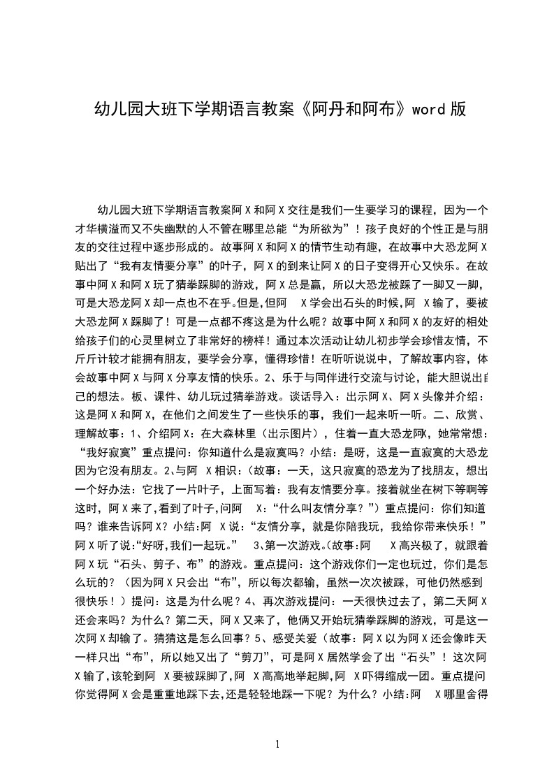 幼儿园大班下学期语言教案阿X和阿X交往是我们一生要学习的课程,因为一个才华横溢而又不失幽默的人不管在哪里总能“为所欲为”!孩子良好的个性正是与朋友的交往过程中逐步形成的。故事阿X和阿X的情节生动有趣,在故事中大恐龙阿X贴出了“我有友情要分享”的叶子,阿X的到来让阿X的日子变得开心又快乐。在故事中阿X和阿X玩了猜拳踩脚的游戏,阿X总是赢,所以大恐龙被踩了一脚又一脚,可是大恐龙阿X却一点也不在乎。但是,但阿X学会出石头的时候,阿X输了,要被大恐龙阿X踩脚了!可是一点都不疼这是为什么呢?故事中阿X和阿X的友好的相处给孩子们的心灵里树立了非常好的榜样!通过本次活动让幼儿初步学会珍惜友情,不斤斤计较才能拥有朋友,要学会分享,懂得珍惜!在听听说说中,了解故事内容,体会故事中阿X与阿X分享友情的快乐。