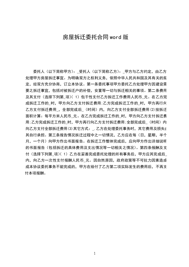 委托人(以下简称甲方):_受托人(以下简称乙方):_甲方与乙方约定,由乙方处理甲方房屋拆迁事宜。为明确双方之权利义务,依照中华人民共和国及其有关的规定,经双方充分协商,订立本协议。