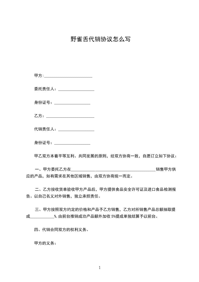 1、甲方保证给乙方提供产品均为正版产品并保证乙方所在区域即________地区的独家代理权,且不得自行直接向乙方所在区域的客户代售本合同的标的物。