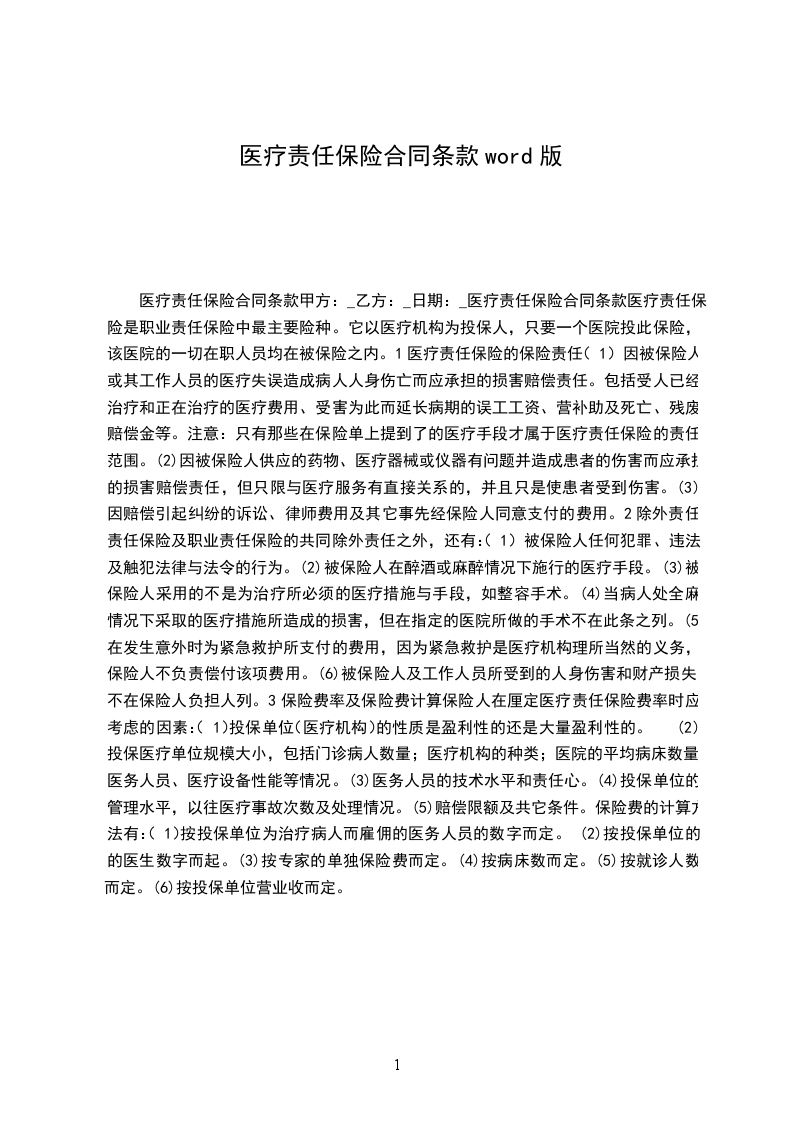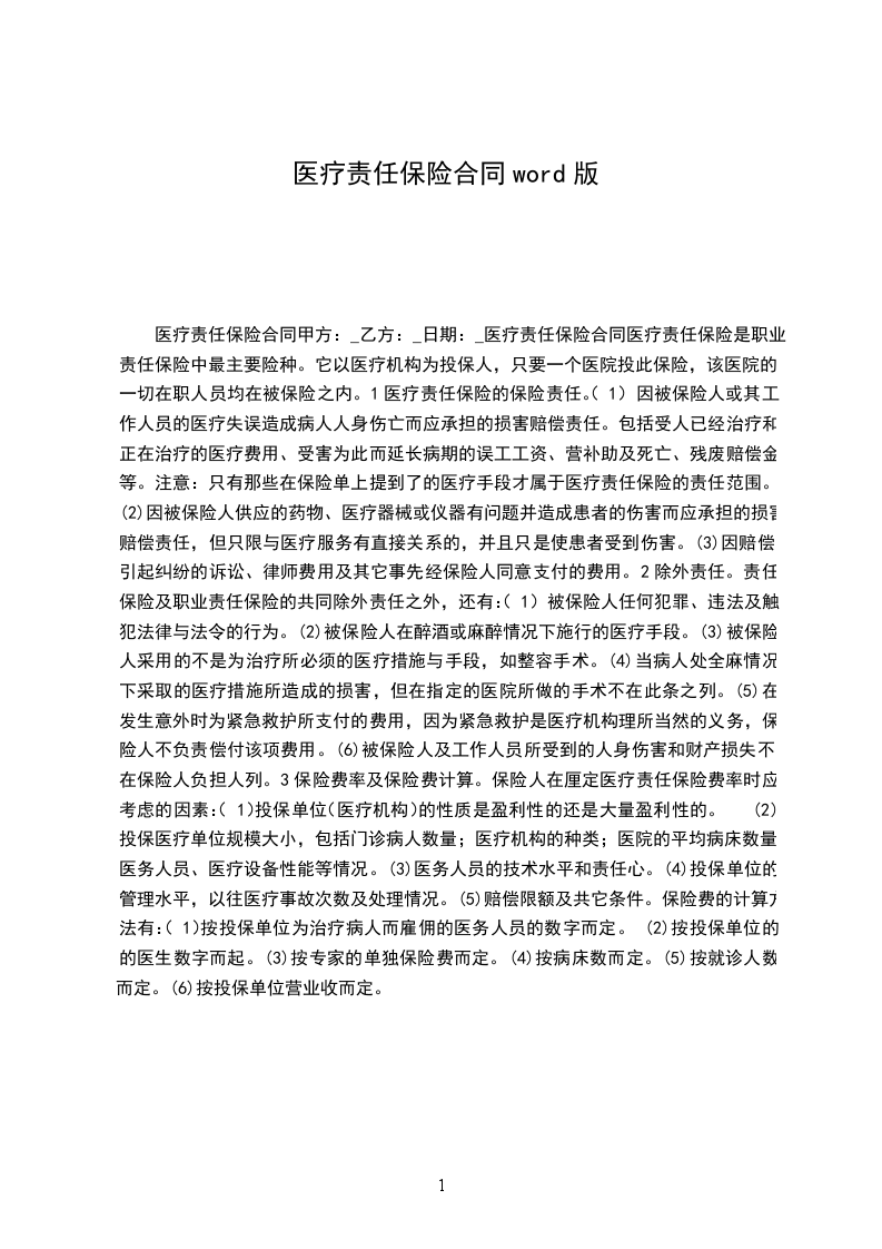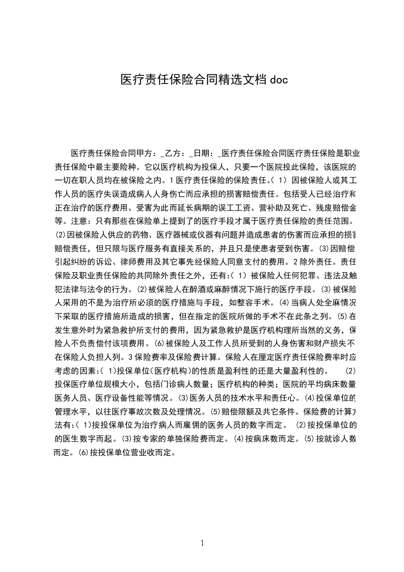医疗责任保险合同甲方:_乙方:_日期:_医疗责任保险合同医疗责任保险是职业责任保险中最主要险种。它以医疗机构为投保人,只要一个医院投此保险,该医院的一切在职人员均在被保险之内。1医疗责任保险的保险责任。