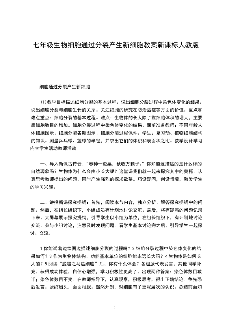 (1)教学目标描述细胞分裂的基本过程。说出细胞分裂过程中染色体变化的结果。说出细胞分裂与细胞生长的关系。关注细胞的研究在防治癌症等方面的价值。重点和难点重点:细胞分裂的基本过程。难点:生物体的长大除了靠细胞体积的增大,主要靠细胞数目的增加。细胞分裂过程中染色体变化的结果。课前准备教师:不同年龄人体细胞图示;细胞分裂各期图示;细胞分裂过程课件。学生:复习动、植物细胞结构的知识。测量乒乓球、篮球的半径,并求出它们的体积和表面积之比。教学设计学习内容学生活动教师活动