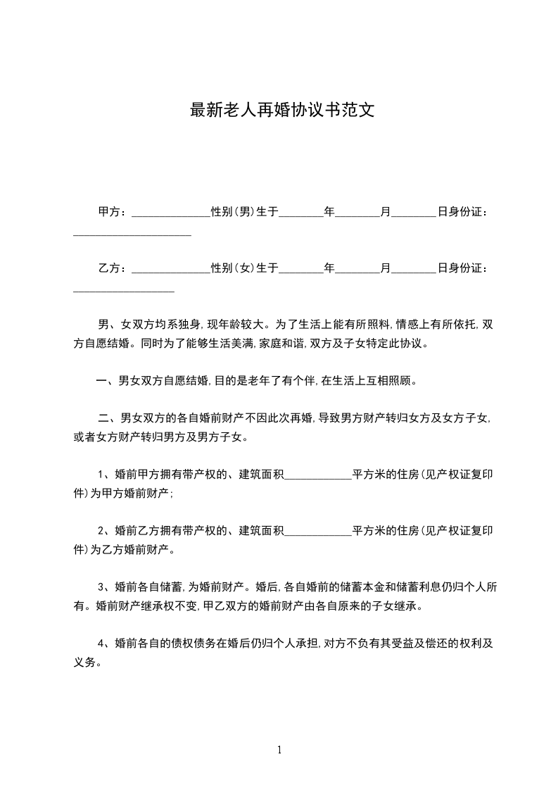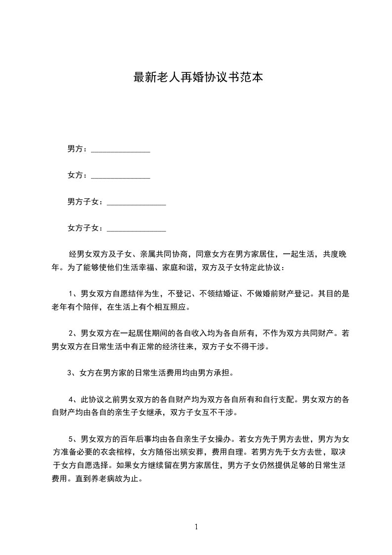 男、女双方均系独身,现年龄较大。为了生活上能有所照料,情感上有所依托,双方自愿结婚。同时为了能够生活美满,家庭和谐,双方及子女特定此协议。