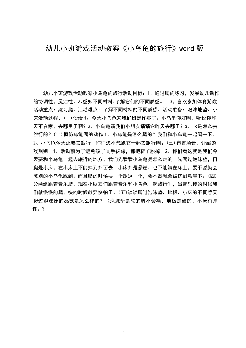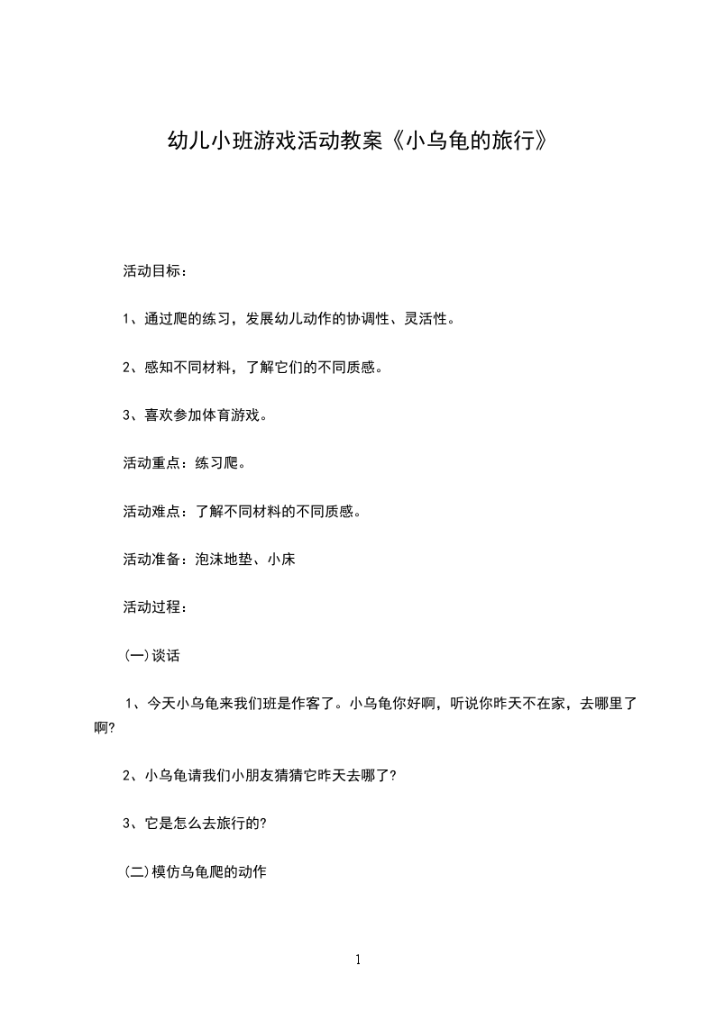 3、喜欢参加体育游戏。活动重点:练习爬。活动难点:了解不同材料的不同质感。活动准备:泡沫地垫、小床