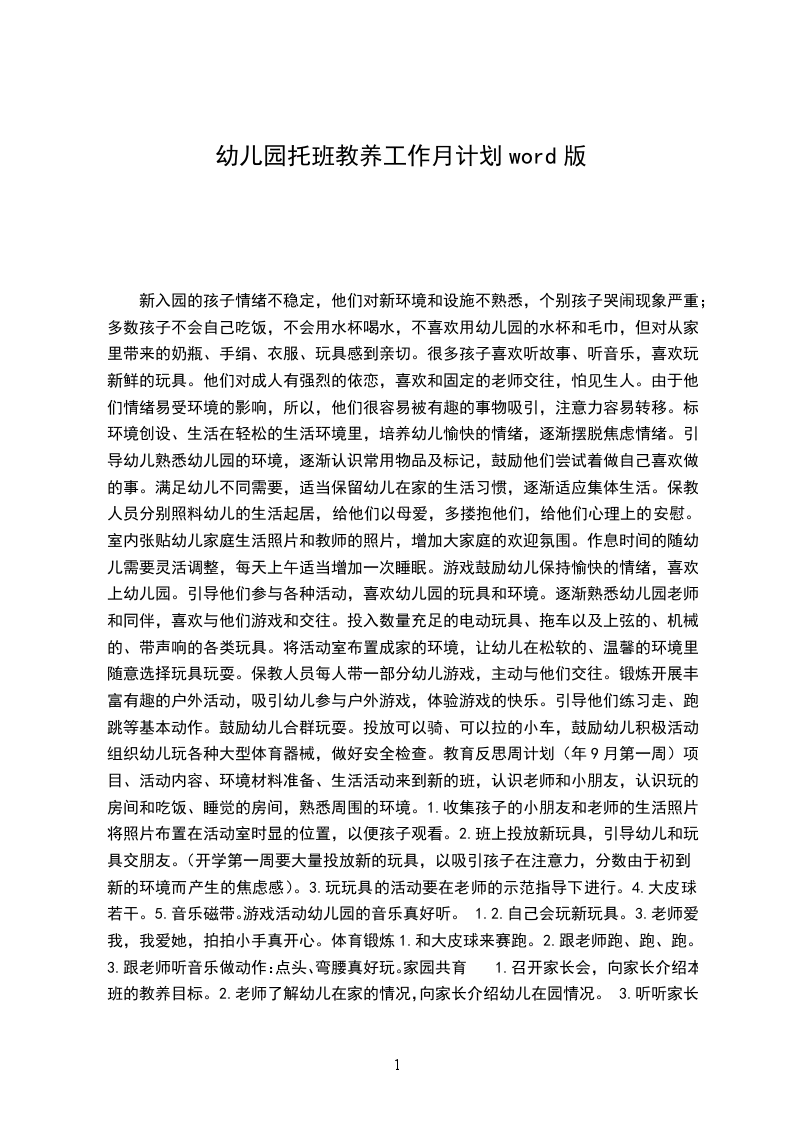 新入园的孩子情绪不稳定,他们对新环境和设施不熟悉,个别孩子哭闹现象严重;多数孩子不会自己吃饭,不会用水杯喝水,不喜欢用幼儿园的水杯和毛巾,但对从家里带来的奶瓶、手绢、衣服、玩具感到亲切。很多孩子喜欢听故事、听音乐,喜欢玩新鲜的玩具。他们对成人有强烈的依恋,喜欢和固定的老师交往,怕见生人。由于他们情绪易受环境的影响,所以,他们很容易被有趣的事物吸引,注意力容易转移。标、环境创设、生活在轻松的生活环境里,培养幼儿愉快的情绪,逐渐摆脱焦虑情绪。引导幼儿熟悉幼儿园的环境,逐渐认识常用物品及标记,鼓励他们尝试着做自己喜欢做的事。满足幼儿不同需要,适当保留幼儿在家的生活习惯,逐渐适应集体生活。保教人员分别照料幼儿的生活起居,给他们以母爱,多搂抱他们,给他们心理上的安慰。室内张贴幼儿家庭生活照片和教师的照片,增加大家庭的欢迎氛围。作息时间的随幼儿需要灵活调整,每天上午适当增加一次睡眠。游戏鼓励幼儿保持愉快的情绪,喜欢上幼儿园。引导他们参与各种活动,喜欢幼儿园的玩具和环境。逐渐熟悉幼儿园老师和同伴,喜欢与他们游戏和交往。投入数量充足的电动玩具、拖车以及上弦的、机械的、带声响的各类玩具。将活动室布置成家的环境,让幼儿在松软的、温馨的环境里随意选择玩具玩耍。保教人员每人带一部分幼儿游戏,主动与他们交往。锻炼开展丰富有趣的户外活动,吸引幼儿参与户外游戏,体验游戏的快乐。引导他们练习走、跑、跳等基本动作。鼓励幼儿合群玩耍。投放可以骑、可以拉的小车,鼓励幼儿积极活动。组织幼儿玩各种大型体育器械,做好安全检查。教育反思周计划(年9月第一周)项目、活动内容、环境材料准备、生活活动来到新的班,认识老师和小朋友,认识玩的房间和吃饭、睡觉的房间,熟悉周围的环境。