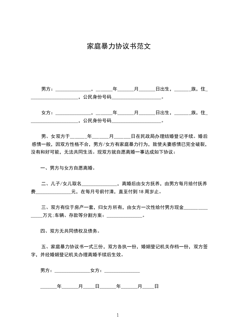男、女双方于_______年_______月_______日在民政局办理结婚登记手续。婚后感情一般,因双方性格不合,男方/女方有家庭暴力行为,致使夫妻感情已完全破裂,没有和好可能,无法共同生活。现双方就自愿离婚一事达成如下协议: