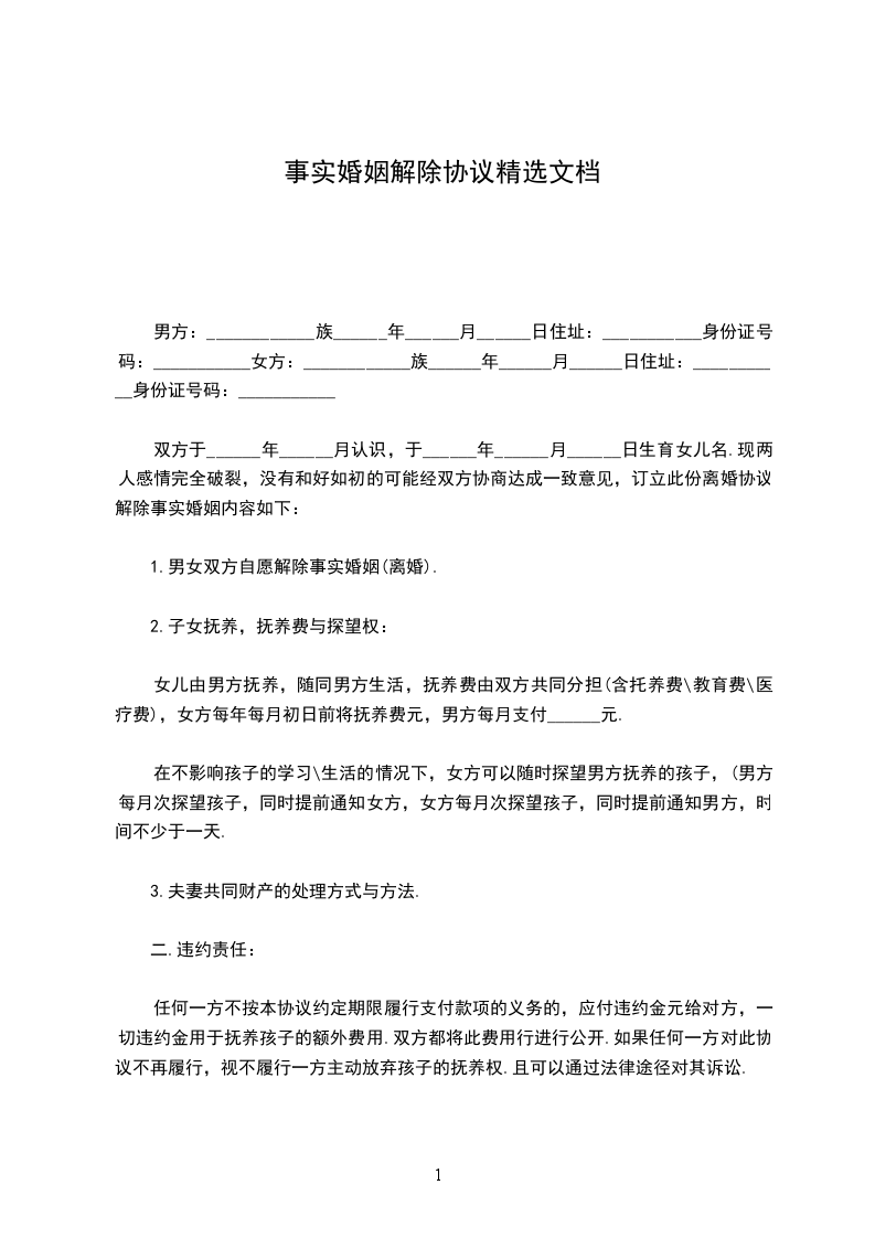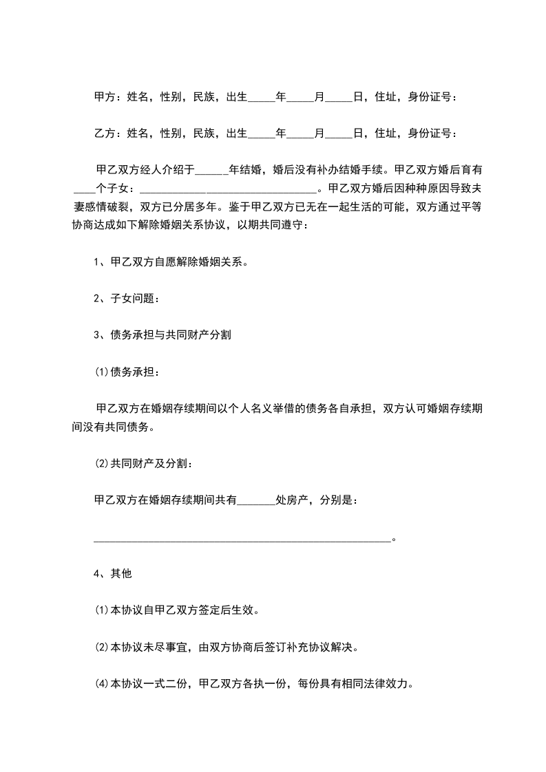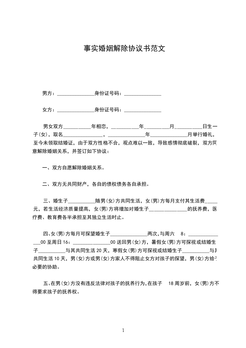 男女双方___________年相恋,___________年__________月___________日生一子(女),取名________________,_______________年_______________月举行婚礼,至今未领取结婚证,由于双方性格不合,观点难以一致,导致感情彻底破裂,双方同意解除婚姻关系,并签订如下协议: