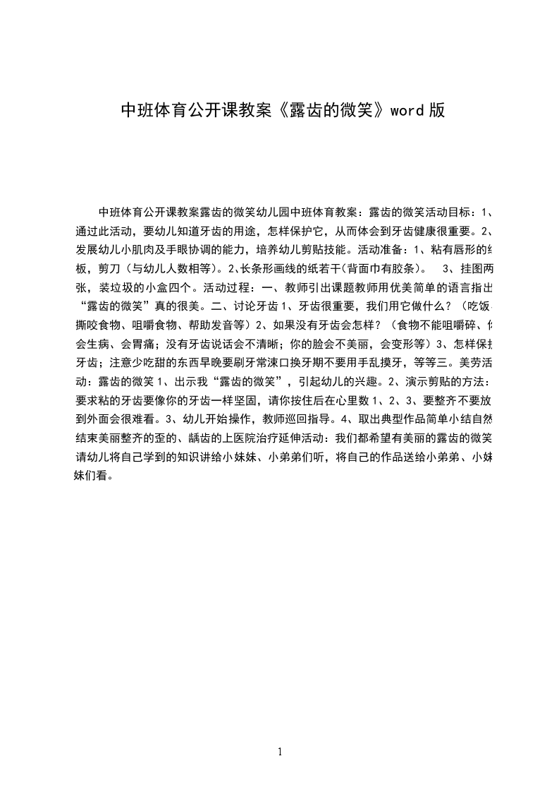 中班体育公开课教案露齿的微笑幼儿园中班体育教案:露齿的微笑活动目标: