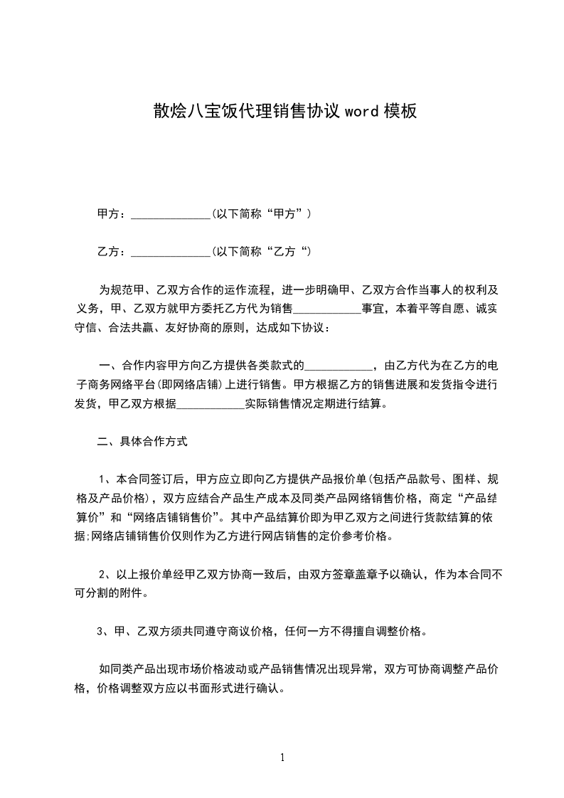 一、合作内容甲方向乙方提供各类款式的____________,由乙方代为在乙方的电子商务网络平台(即网络店铺)上进行销售。甲方根据乙方的销售进展和发货指令进行发货,甲乙双方根据____________实际销售情况定期进行结算。