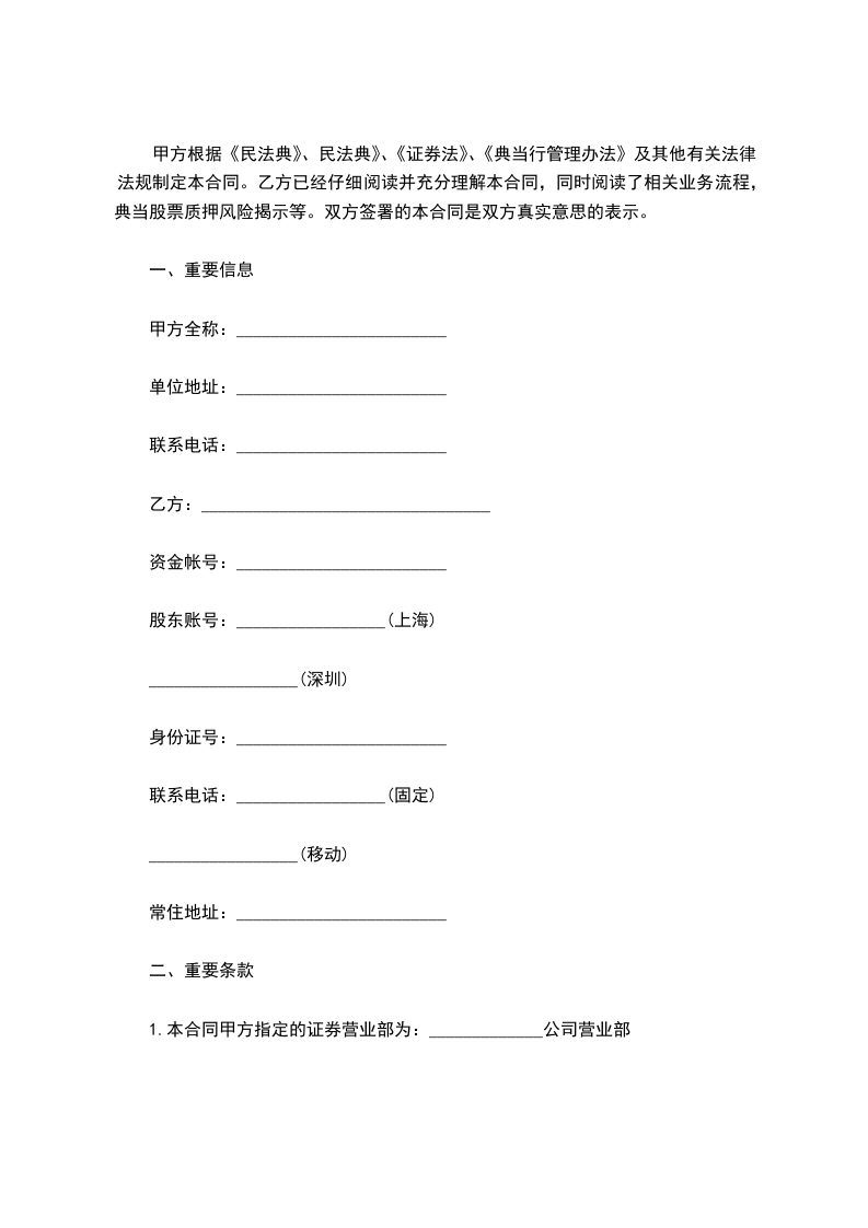 甲方根据《民法典》、民法典》、《证券法》、《典当行管理办法》及其他有关法律法规制定本合同。乙方已经仔细阅读并充分理解本合同,同时阅读了相关业务流程,典当股票质押风险揭示等。双方签署的本合同是双方真实意思的表示。