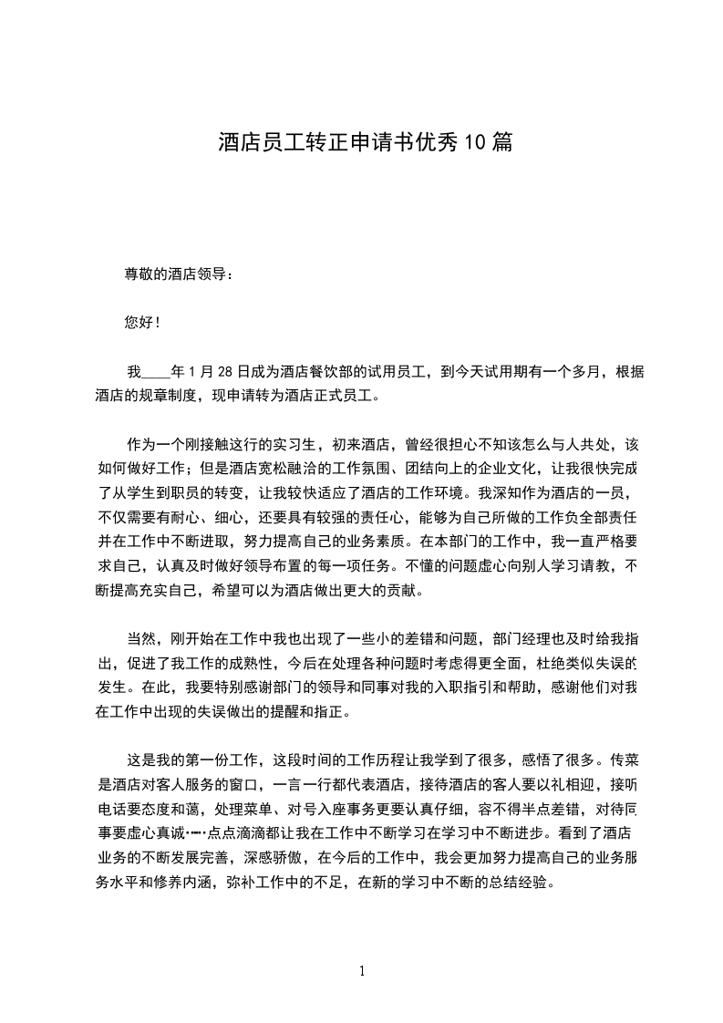 我____年1月28日成为酒店餐饮部的试用员工,到今天试用期有一个多月,根据酒店的规章制度,现申请转为酒店正式员工。
