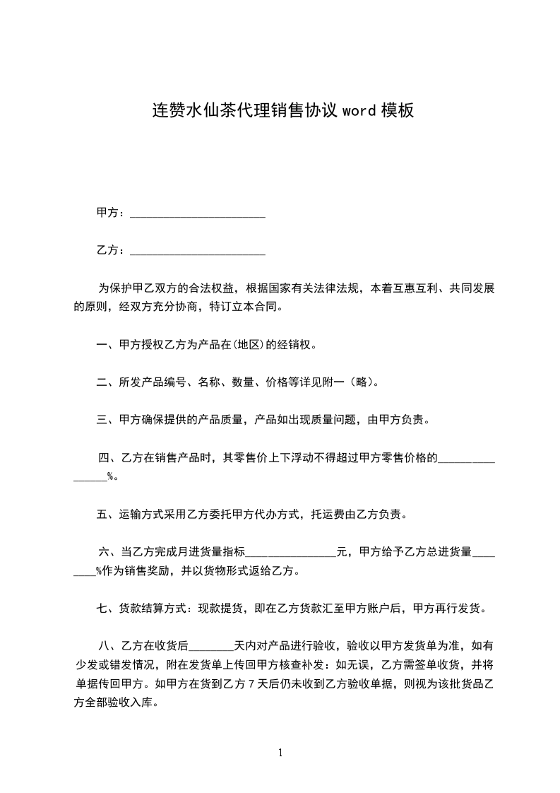 六、当乙方完成月进货量指标________________元,甲方给予乙方总进货量________%作为销售奖励,并以货物形式返给乙方。