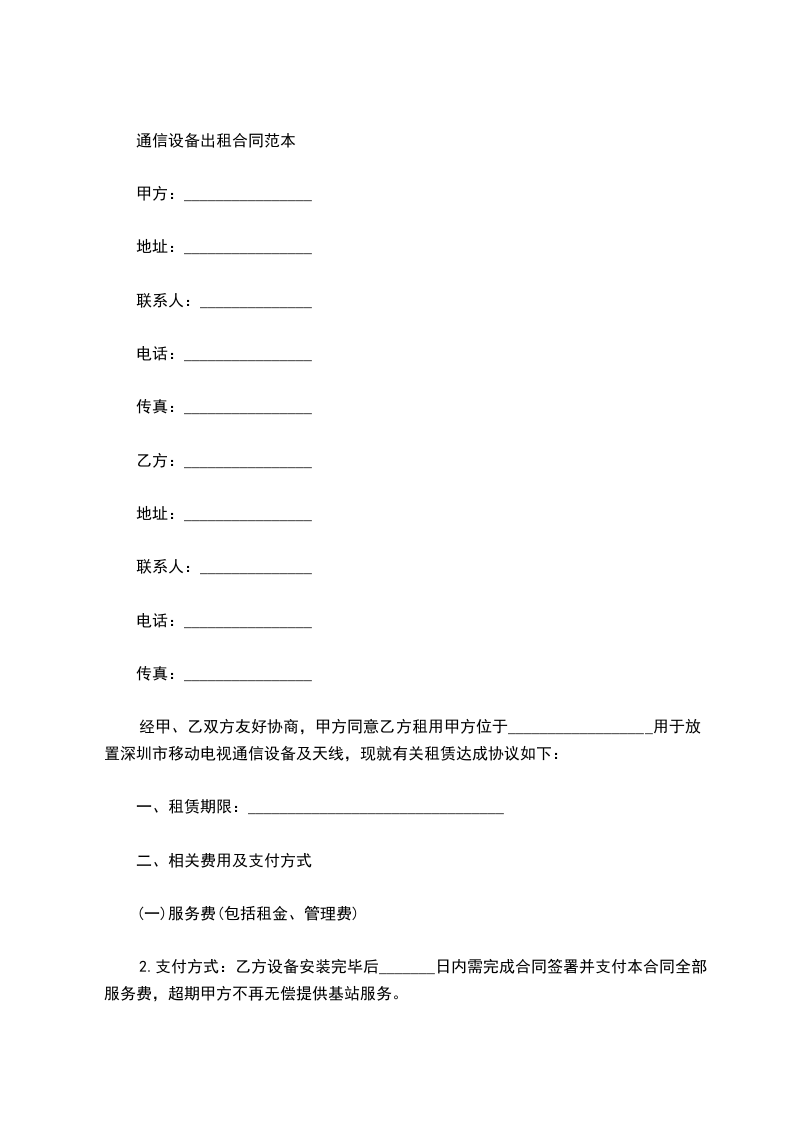 2.支付方式:乙方设备安装完毕后_______日内需完成合同签署并支付本合同全部服务费,超期甲方不再无偿提供基站服务。