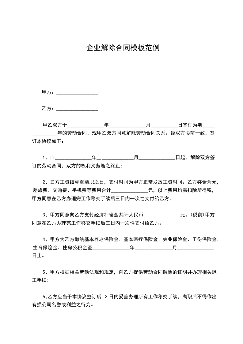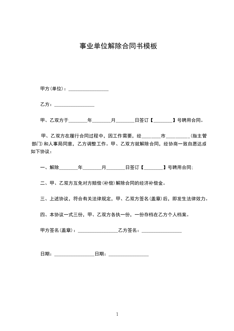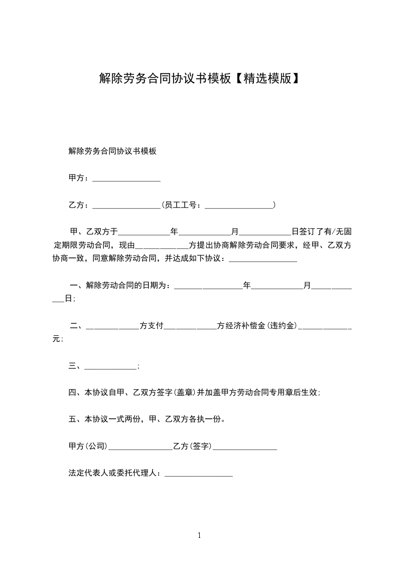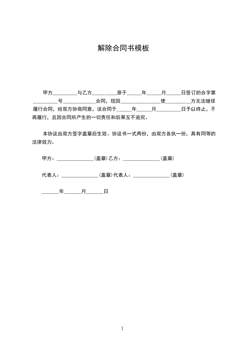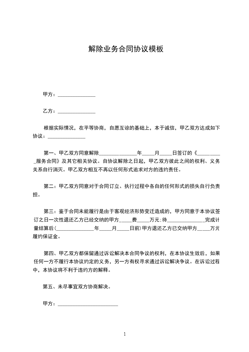 第一、甲乙双方同意解除_______________年_____月_____日签订的《__________服务合同》及其它相关协议。自协议解除之日起,甲乙双方彼此之间的权利、义务关系自行消灭。甲乙双方相互不再以任何形式追求对方的违约责任。