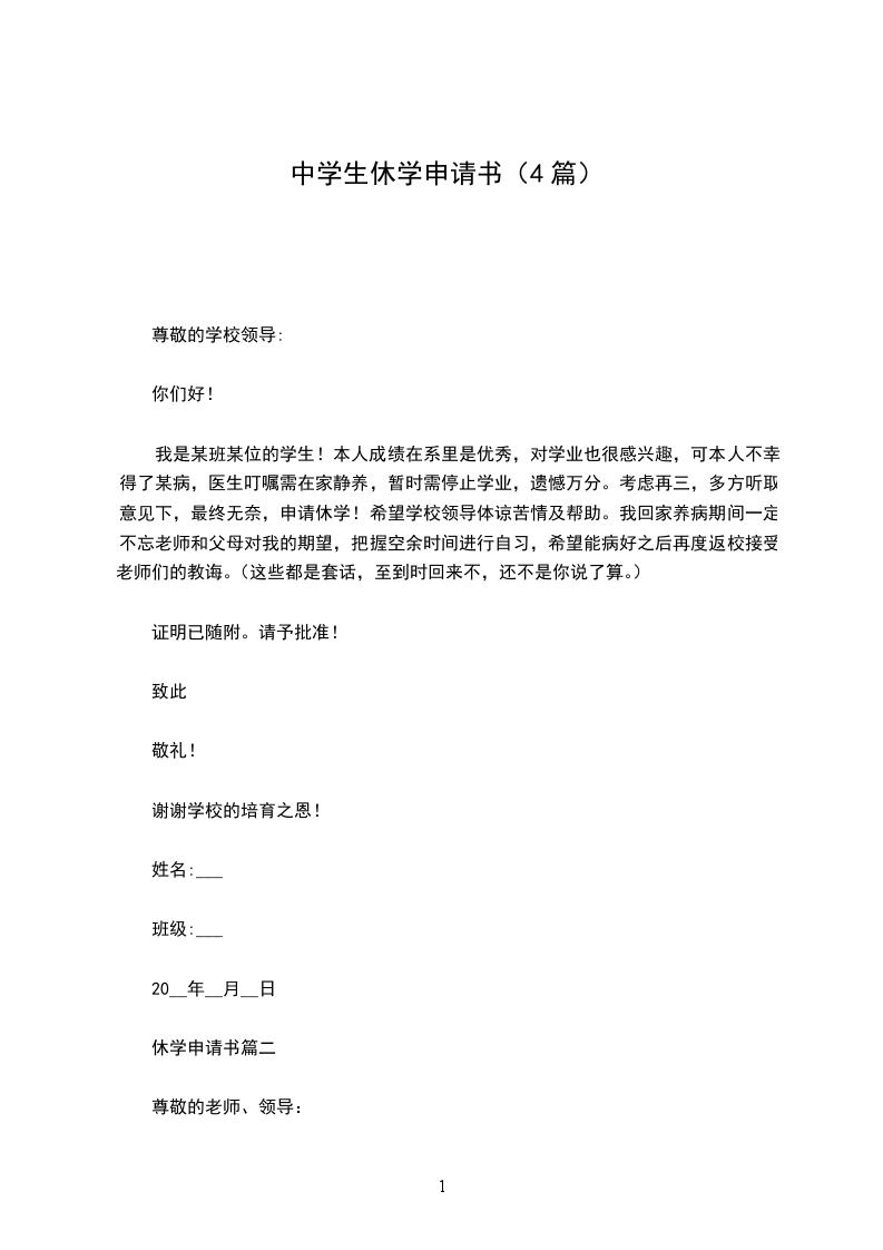 我是__学院__系__级__专业的学生___,本人因为____原因(病、事、参军等)导致现在不能上学,和家人慎重考虑后特向学院提出休学申请,时间从20__年--20__年,共一年时间。望批准为感!