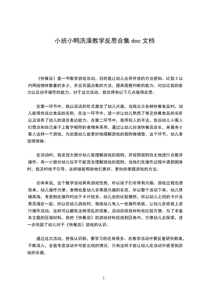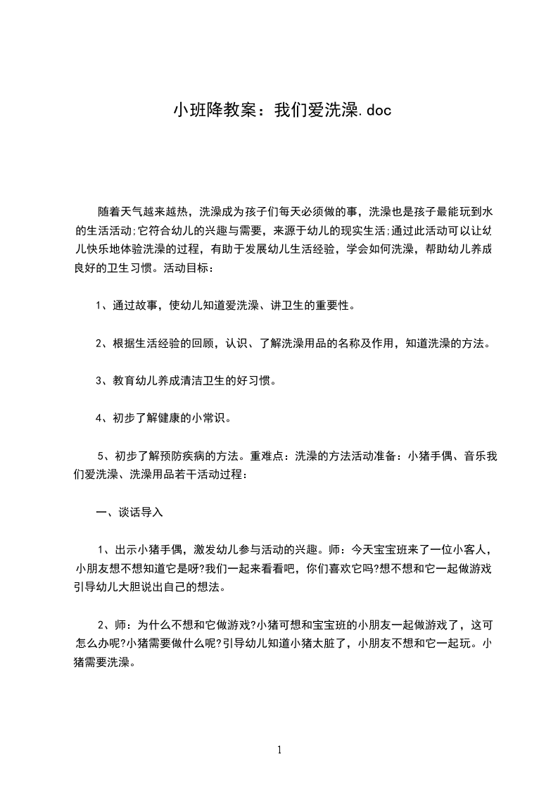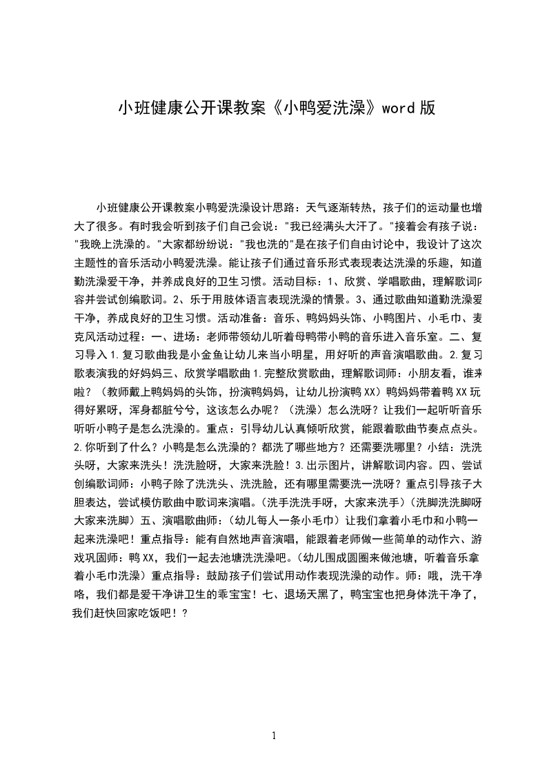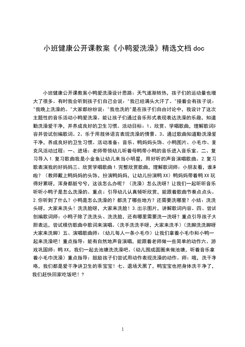 小班健康公开课教案小鸭爱洗澡设计思路:天气逐渐转热,孩子们的运动量也增大了很多。有时我会听到孩子们自己会说:"我已经满头大汗了。"接着会有孩子说:"我晚上洗澡的。"大家都纷纷说:"我也洗的"是在孩子们自由讨论中,我设计了这次主题性的音乐活动小鸭爱洗澡。能让孩子们通过音乐形式表现表达洗澡的乐趣,知道勤洗澡爱干净,并养成良好的卫生习惯。活动目标: