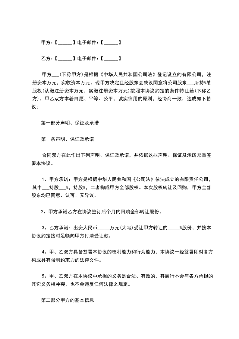 3、乙方承诺:出资人民币_____万元(大写)受让甲方转让的_____%股份,并按本协议约定按时足额向甲方付清受让款。