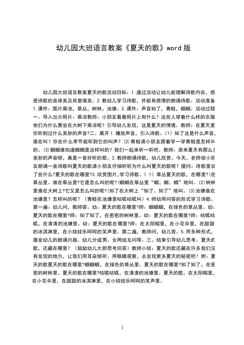 幼儿园大班语言教案夏天的歌活动目标: