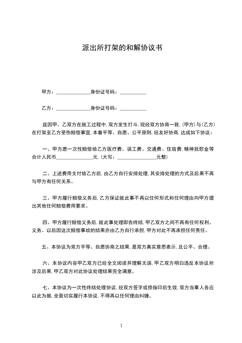 兹因甲、乙双方在施工过程中,双方发生打斗,现经双方协商一致,(甲方)与(乙方)在打架至乙方受伤赔偿事宜,本着平等、自愿、公平原则,经友好协商,达成如下协议: