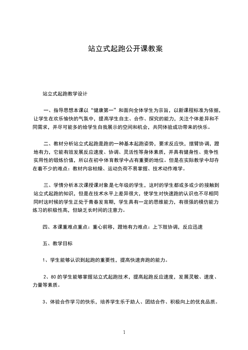 二、教材分析站立式起跑是跑的一种基本起跑姿势,要求反应快,摆臂协调,蹬地有力,它能有效发展反应速度、协调、灵活性等身体素质,并具有健身性、竞争性、实用性的锻炼价值,所以在初中体育教学中占有重要的地位。但是在实际教学中却存在着不少的难点:教材内容枯燥、运动负荷不易掌握、技术动作难学。