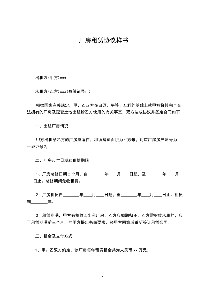 1、甲、乙双方约定,该厂房每年租赁租金共为人民币xx万元。