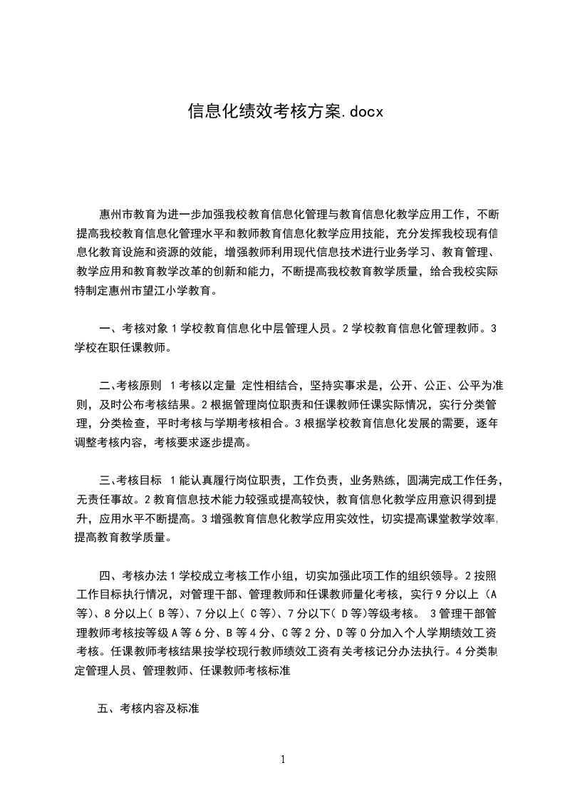 二、考核原则1考核以定量+定性相结合,坚持实事求是,公开、公正、公平为准则,及时公布考核结果。2根据管理岗位职责和任课教师任课实际情况,实行分类管理,分类检查,平时考核与学期考核相合。3根据学校教育信息化发展的需要,逐年调整考核内容,考核要求逐步提高。