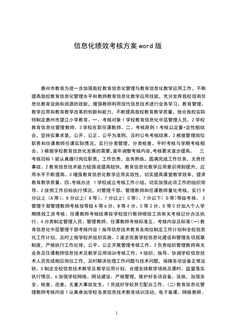 (一)教育信息化中层管理干部考核内容1指导信息技术教育各岗位制定工作计划和全校信息化工作计划,及时上报学校并组织实施。2逐步完善学校信息化建设和管理各项规章制度,严格执行工作纪律,公平、公正开展管理考核工作。3负责组织管理教师有关业务及任课教师信息技术及教学应用培训考核工作。4组织、指导、协调学校信息技术人员完成相应岗位工作,及时解决处理工作问题与技术问题,保障各项设备正常运转。5制定全校信息技术教学及教学应用计划,合理安排教学场地及课时、监督落实执行情况。6加强学校网络、网站建设、严格管理,维护好各项设备、设施,加强安全、检查、巡查,无重大事故发生。7完成好学校其它配合工作。