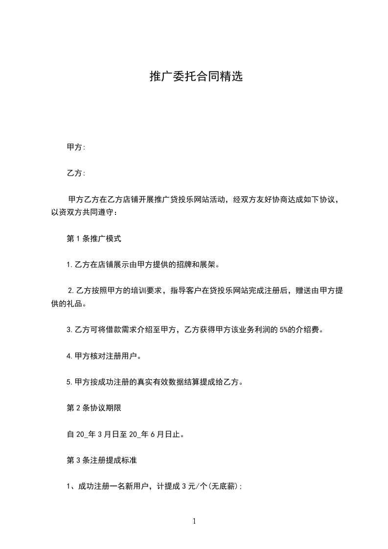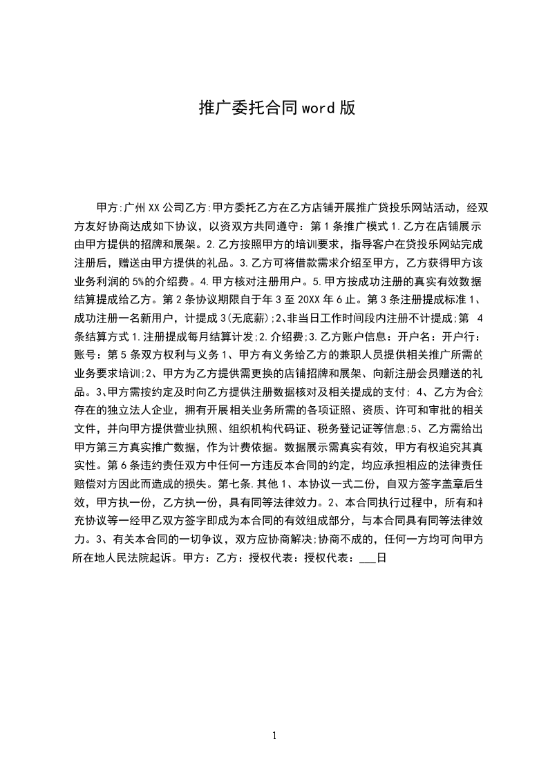 甲方:广州XX公司乙方:甲方委托乙方在乙方店铺开展推广贷投乐网站活动,经双方友好协商达成如下协议,以资双方共同遵守:第1条推广模式