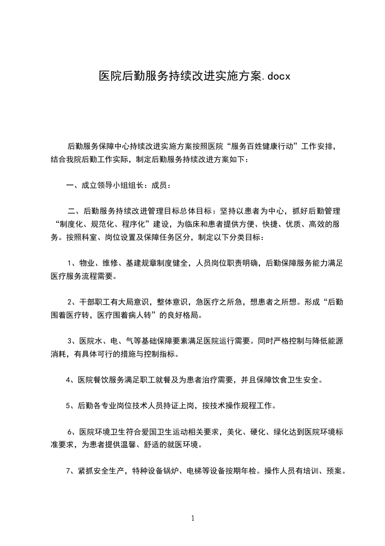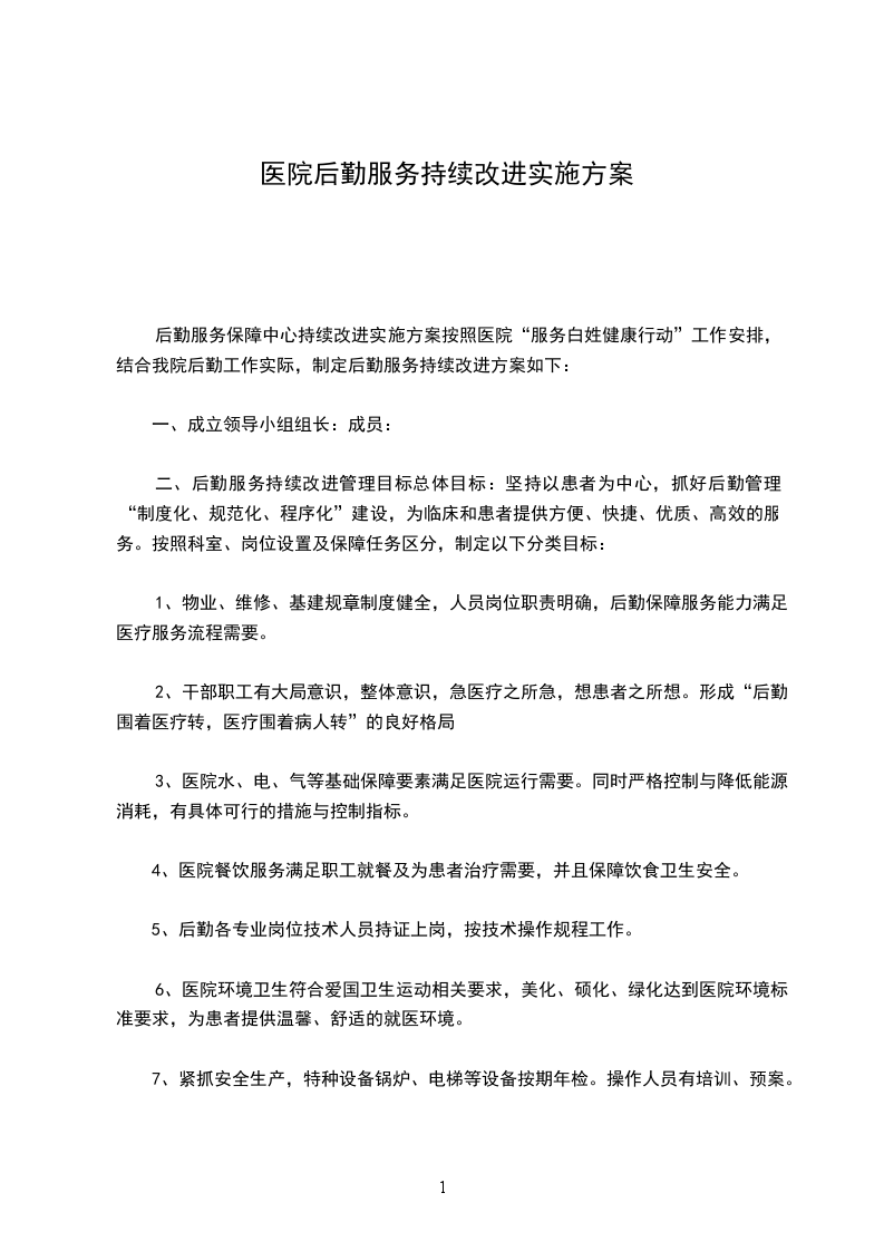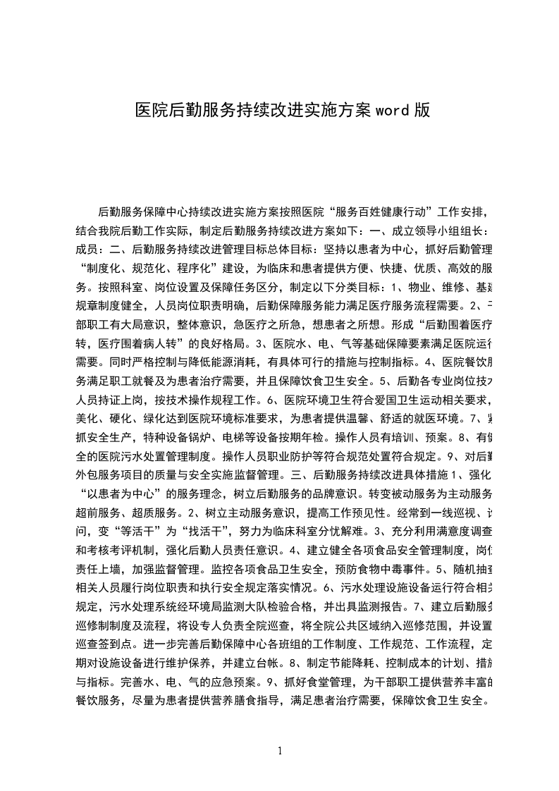 后勤服务保障中心持续改进实施方案按照医院“服务百姓健康行动”工作安排,结合我院后勤工作实际,制定后勤服务持续改进方案如下: