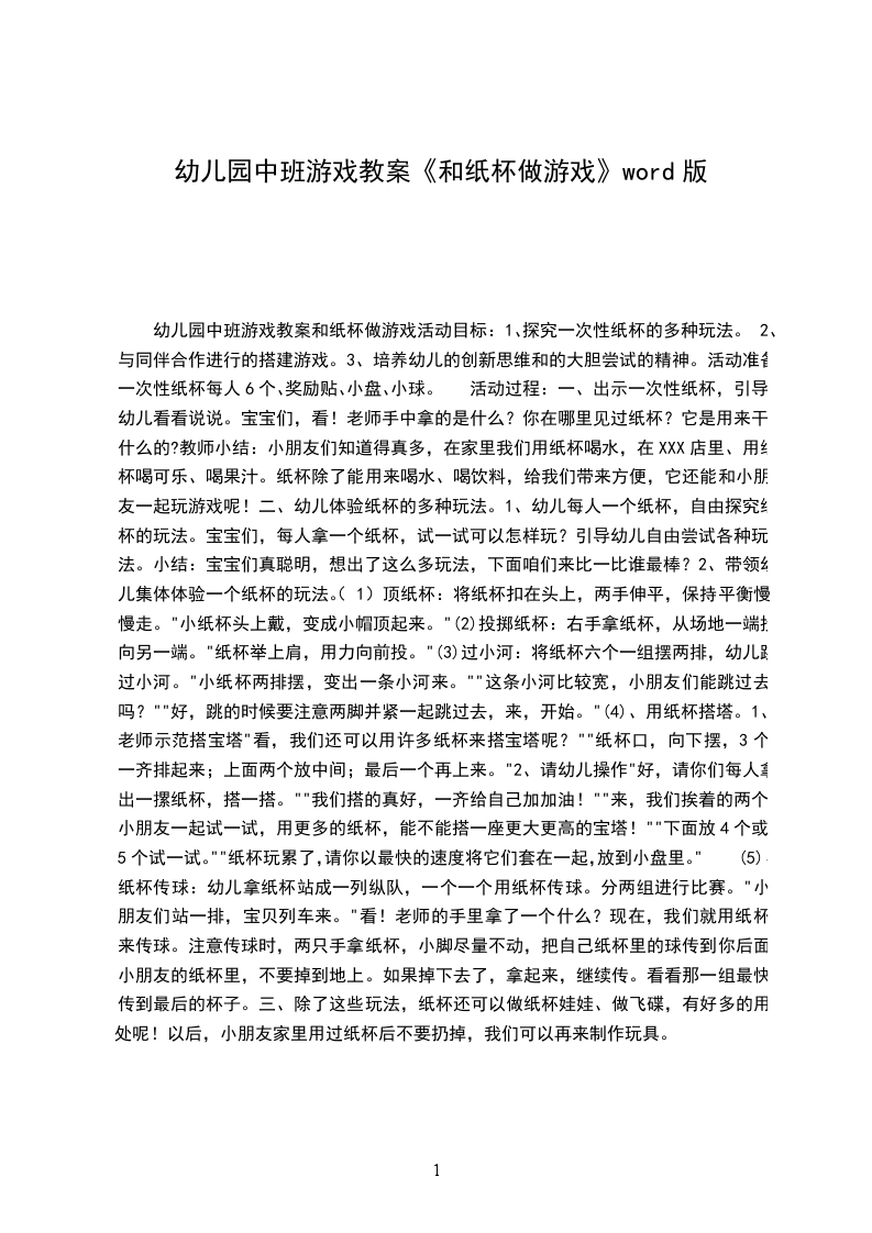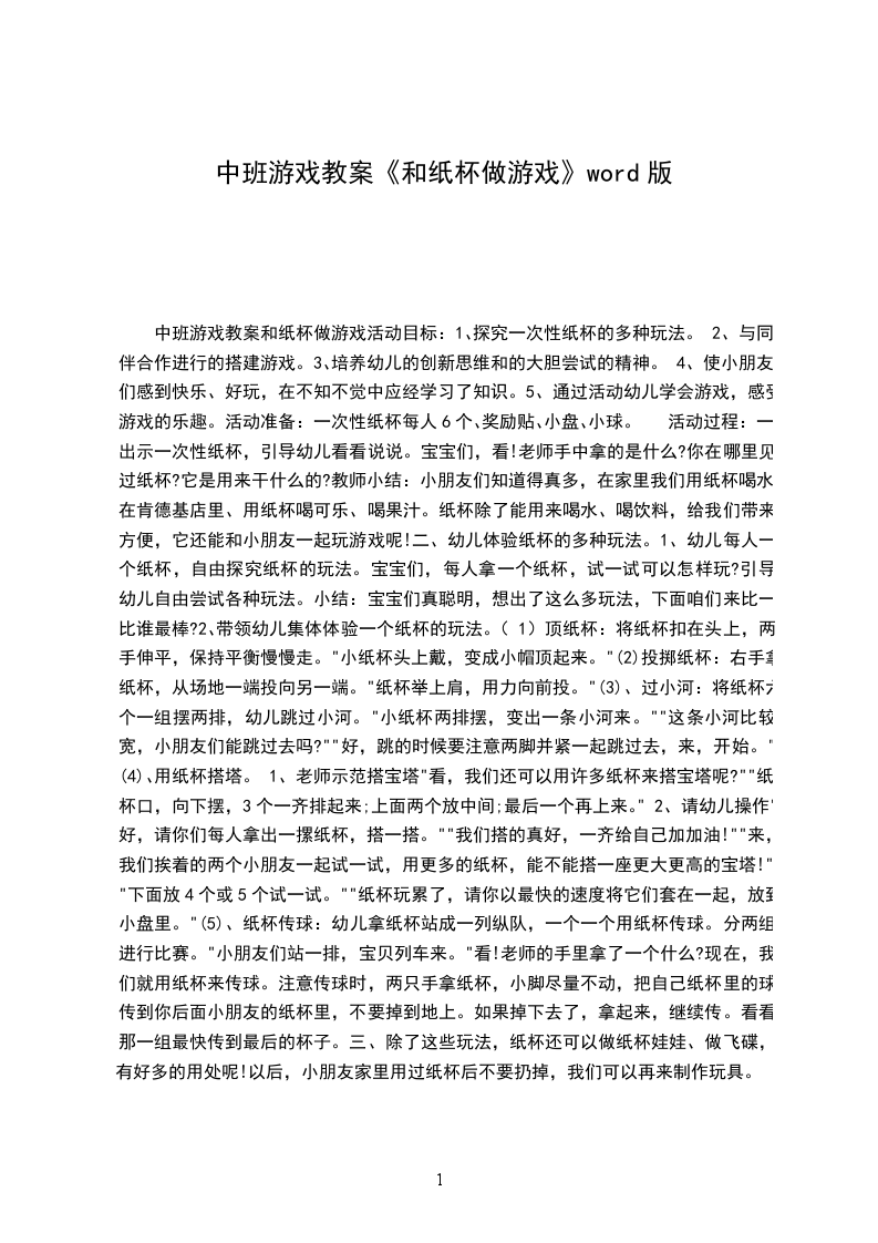 幼儿园中班游戏教案和纸杯做游戏活动目标: