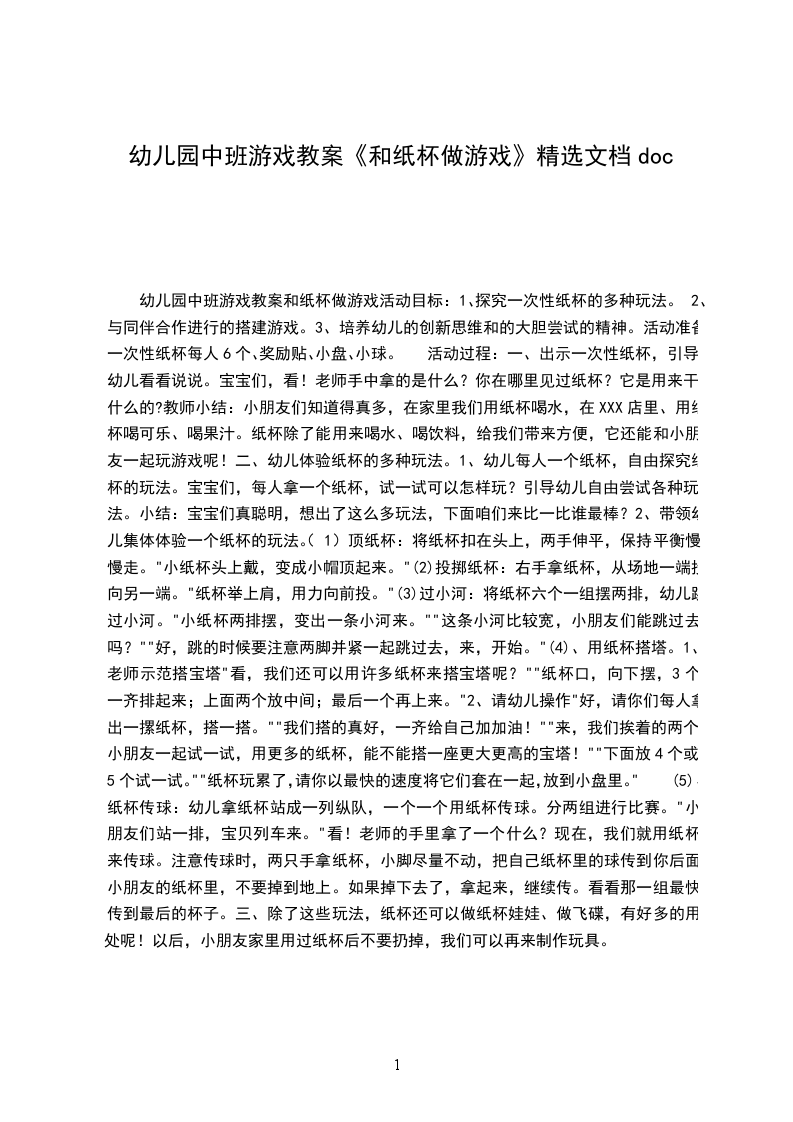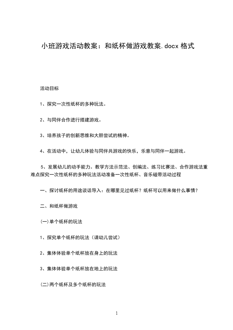 一、出示一次性纸杯,引导幼儿看看说说。宝宝们,看!老师手中拿的是什么?你在哪里见过纸杯?它是用来干什么的?教师小结:小朋友们知道得真多,在家里我们用纸杯喝水,在XXX店里、用纸杯喝可乐、喝果汁。纸杯除了能用来喝水、喝饮料,给我们带来方便,它还能和小朋友一起玩游戏呢!