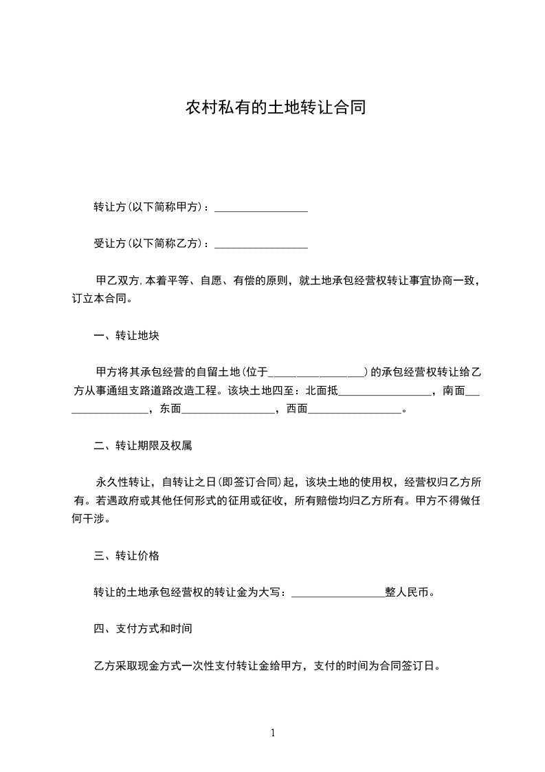 甲方将其承包经营的自留土地(位于_________________)的承包经营权转让给乙方从事通组支路道路改造工程。该块土地四至:北面抵_________________,南面_________________,东面_________________,西面_________________。