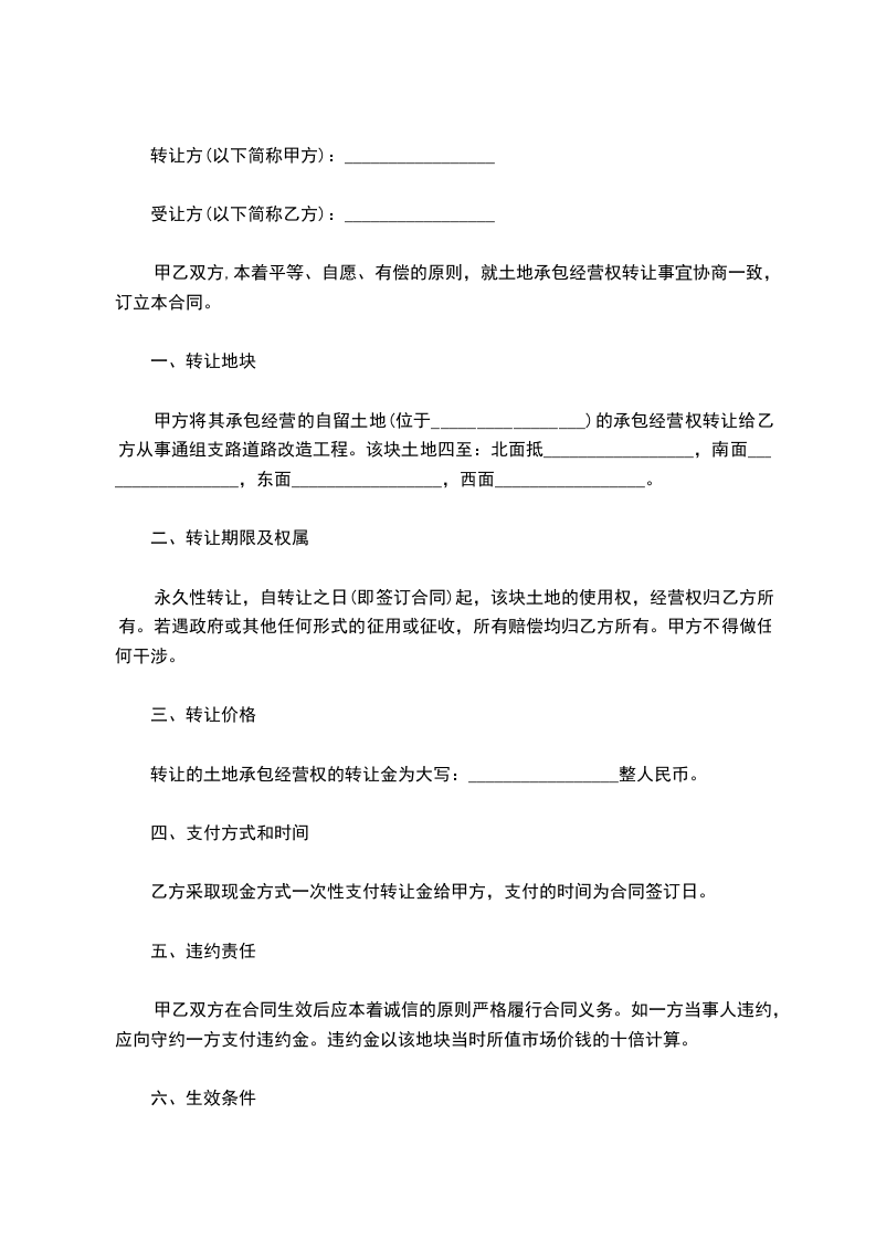 甲方将其承包经营的自留土地(位于_________________)的承包经营权转让给乙方从事通组支路道路改造工程。该块土地四至:北面抵_________________,南面_________________,东面_________________,西面_________________。