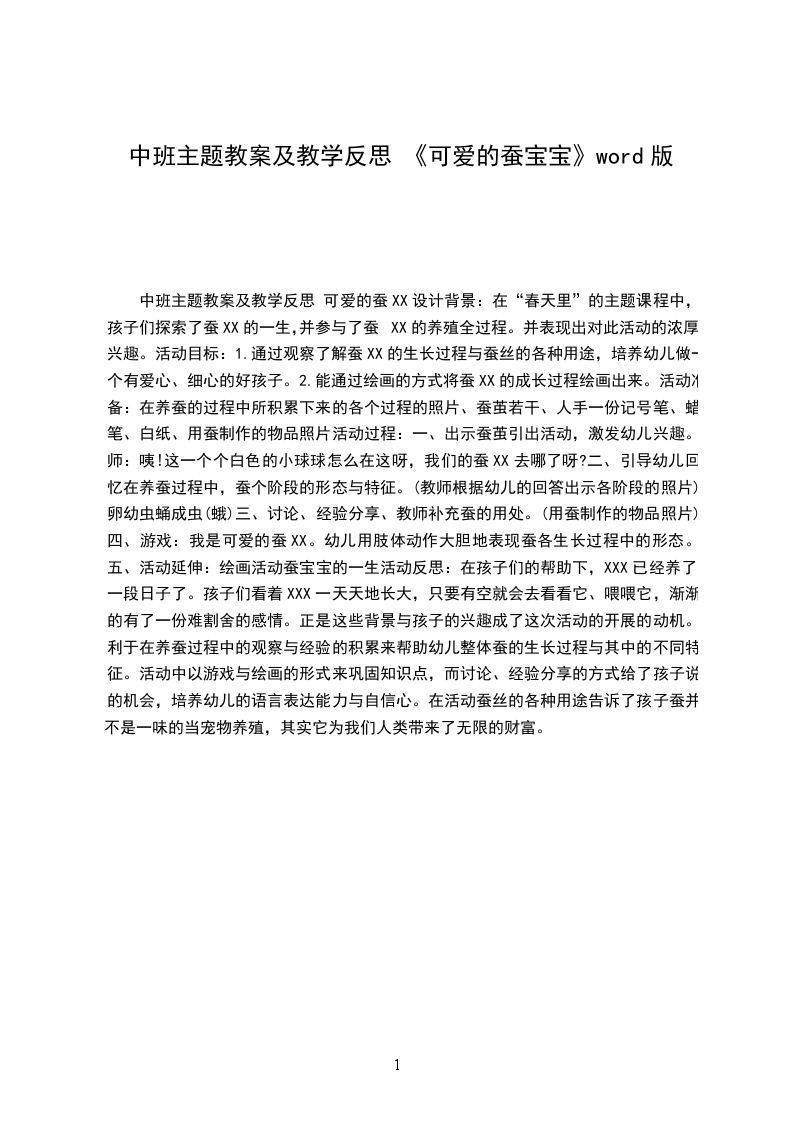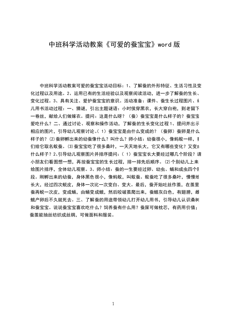 一、猜谜,引出主题谜语:小时侯穿黑衣,长大穿白袍,到老留下一卷丝,献给人们做嫁衣。提问:这是什么呀?(蚕)蚕宝宝是什么样子的?蚕宝宝爱吃什么?