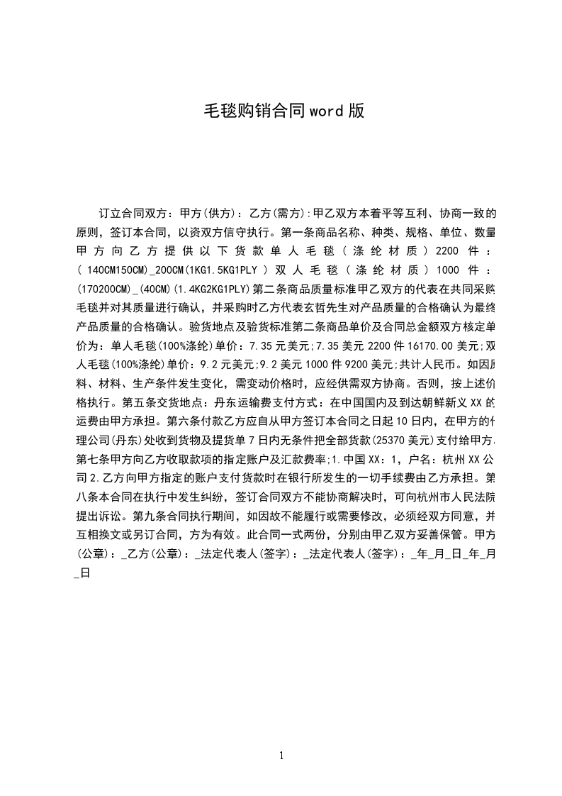 第二条商品单价及合同总金额双方核定单价为:单人毛毯(100%涤纶)单价:
