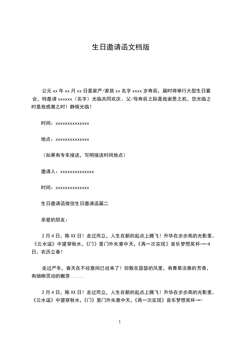 公元xx年xx月xx日是家严/家慈xx名字xxxx岁寿辰,届时将举行大型生日宴会,特邀请xxxxxx(名字)光临共同欢庆。父/母寿辰之际是我谢恩之机,您光临之时是我感激之时!静候光临!