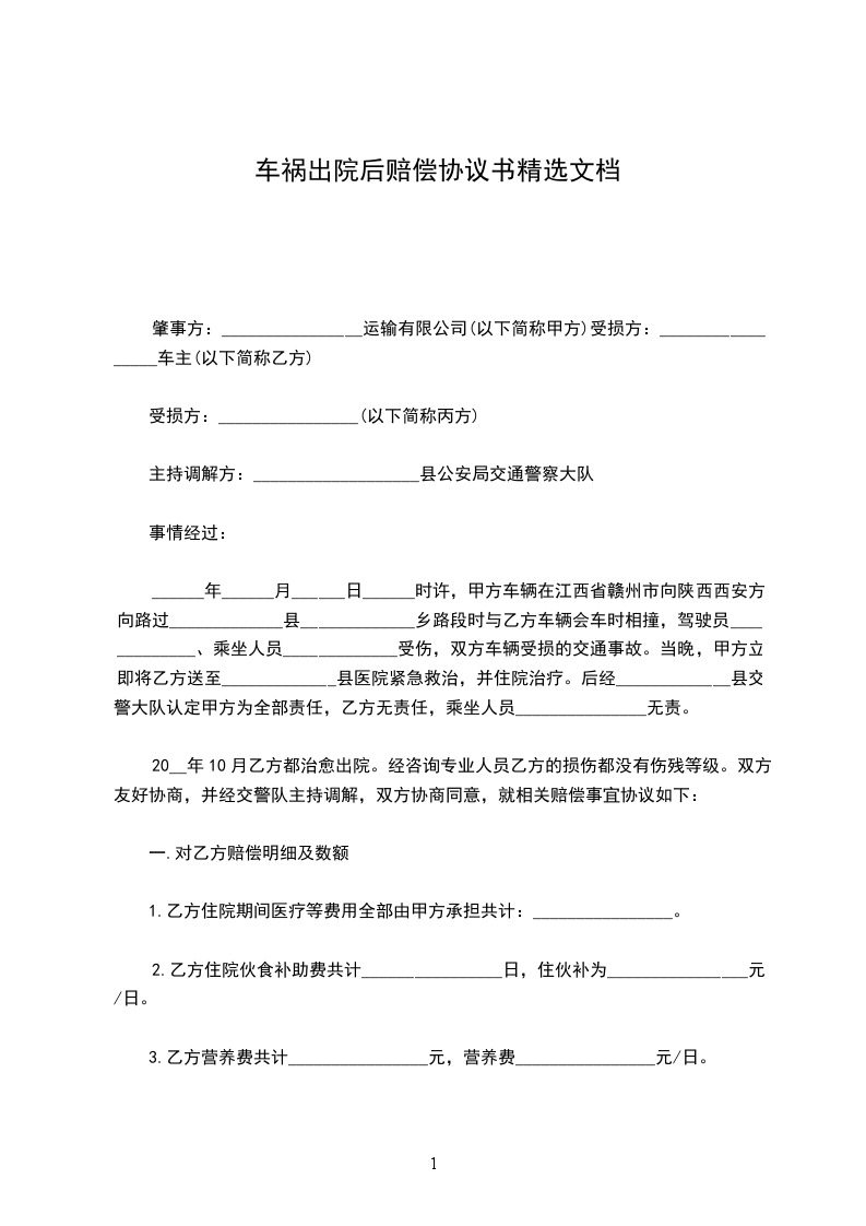 一、甲方同意支付医疗费及各种人身损害赔偿费用人民币________元(大写:________元整)给乙方。