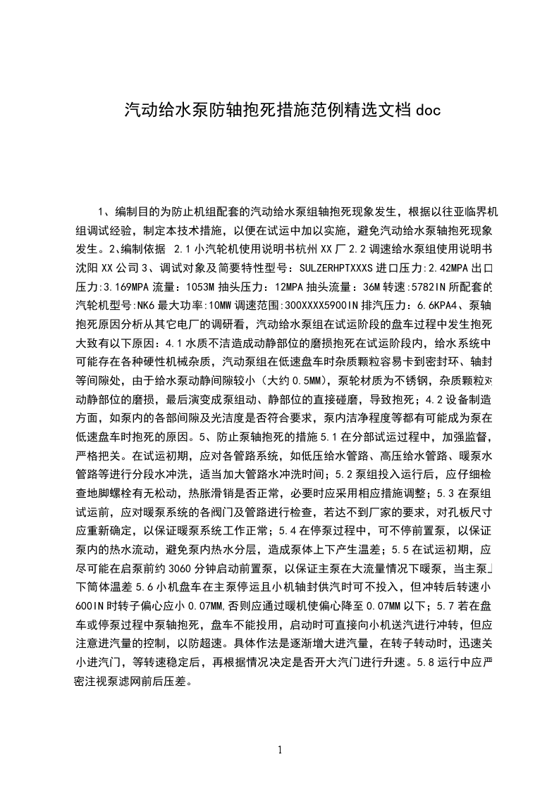 1、编制目的为防止机组配套的汽动给水泵组轴抱死现象发生,根据以往亚临界机组调试经验,制定本技术措施,以便在试运中加以实施,避免汽动给水泵轴抱死现象发生。