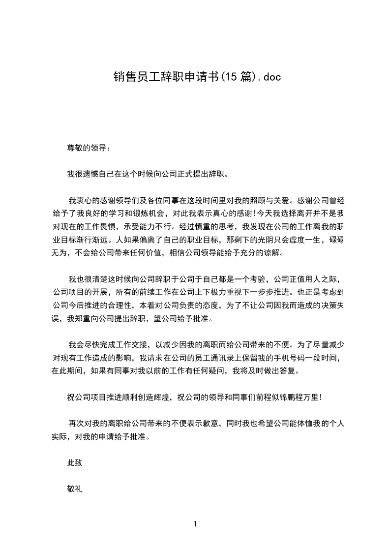 销售员工辞职申请书15