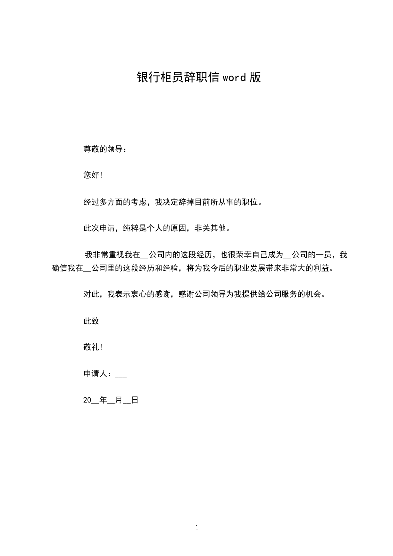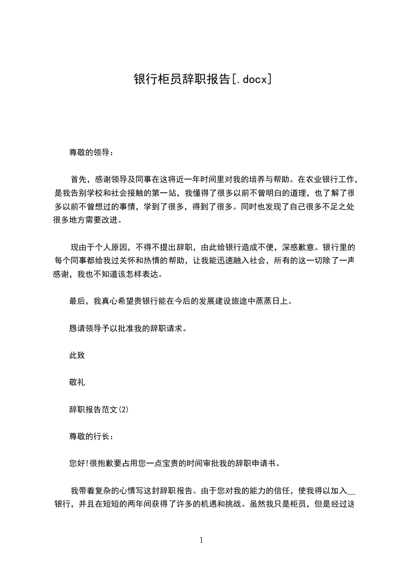 我带着复杂的心情写这封辞职报告。由于您对我的能力的信任,使我得以加入银行,并且在短短的两年间获得了许多的机遇和挑战。虽然我只是柜员,但是经过这两年的工作,还是让我学会了很多知识、积累了一定的经验。对此我深怀感激!